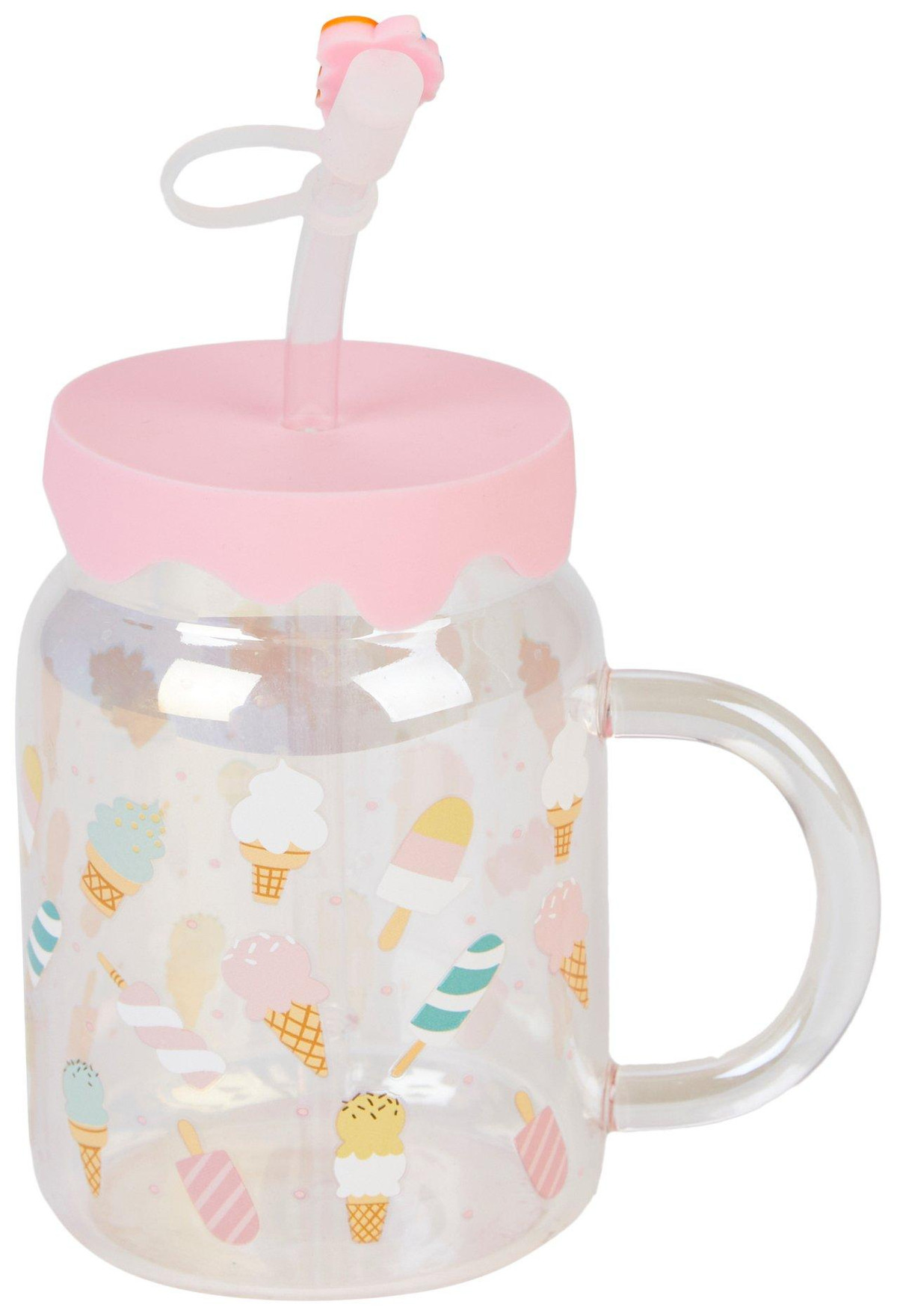 Indulge in the perfect summer sipper with this glass tumbler featuring playful ice cream cone designs. Complete with a matching lid and a straw topped with an ice cream cone accent, its ideal for enjoying chilled drinks with a touch of sweetness and fun.