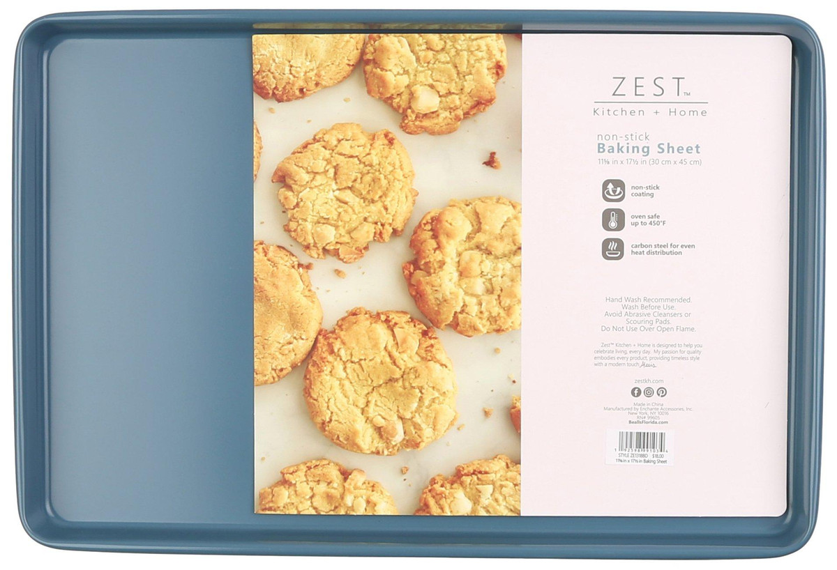 Zest Kitchen + Home produces sophisticated home products and textiles with an international sense of style and quality. This high-quality baking sheet is oven safe up to 450 degrees, features a smooth nonstick coating and is composed of carbon steel for even heat distribution. Measures 11-5/8in x 17.5in.