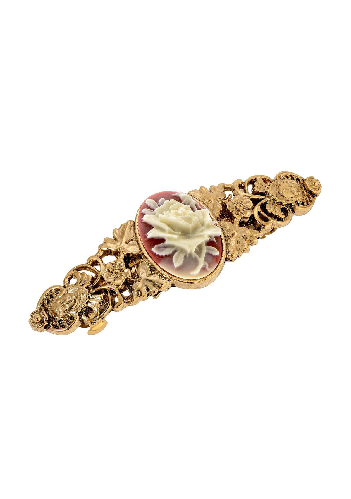 The 1928 Jewelry Crowned Princess Floral Cameo Hair Barrette features two elegant crowned princesses on each end, framing an intricate floral design. At the center, an oval flower cameo stone adds a touch of vintage charm and sophistication. Length 3.25 in., width 26mm.