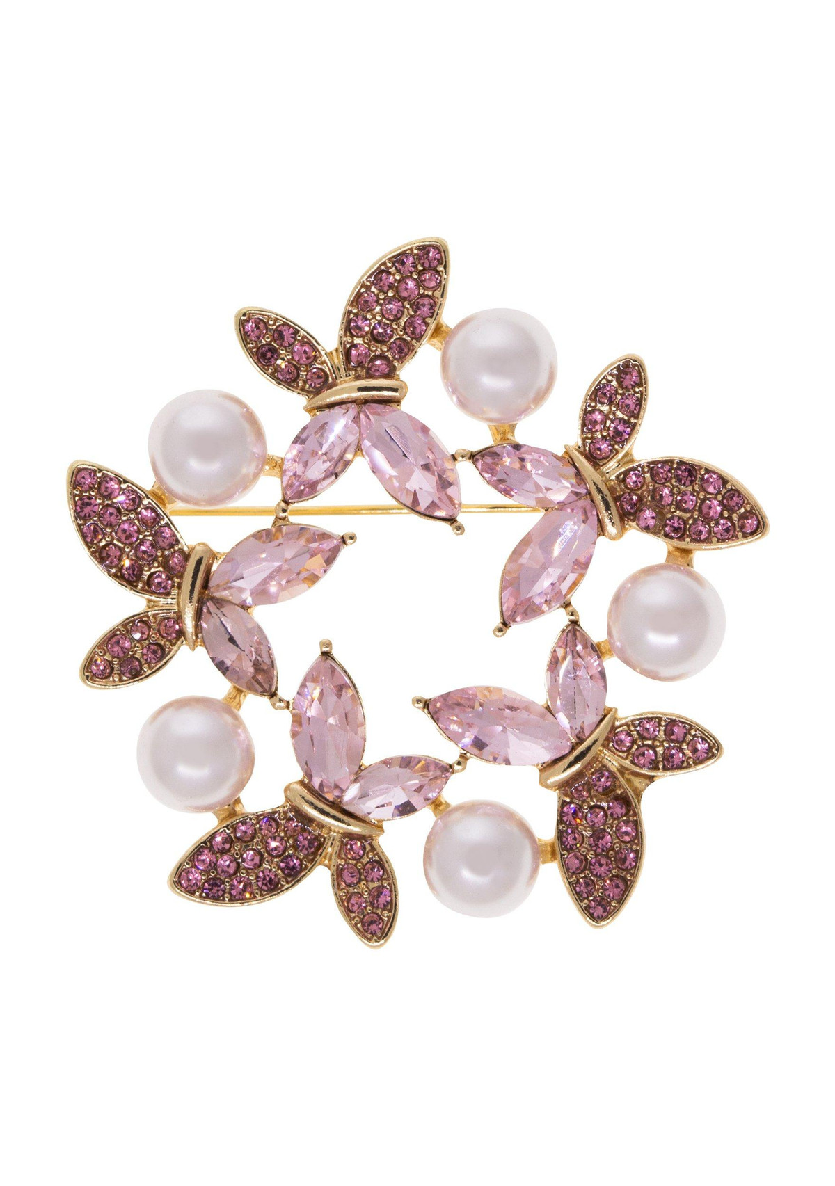 Discover the allure of our captivating pin, featuring five gracefully fluttering butterflies, each delicately adorned with round and navette crystals. The intricate design is complemented by a lustrous faux pearl accent, adding a touch of vintage charm. This unique accessory is perfect for those who appreciate timeless elegance and distinctive style. Elevate any outfit with this exquisite pin, a true testament to refined craftsmanship and beauty. Length 2 in., width 50mm..