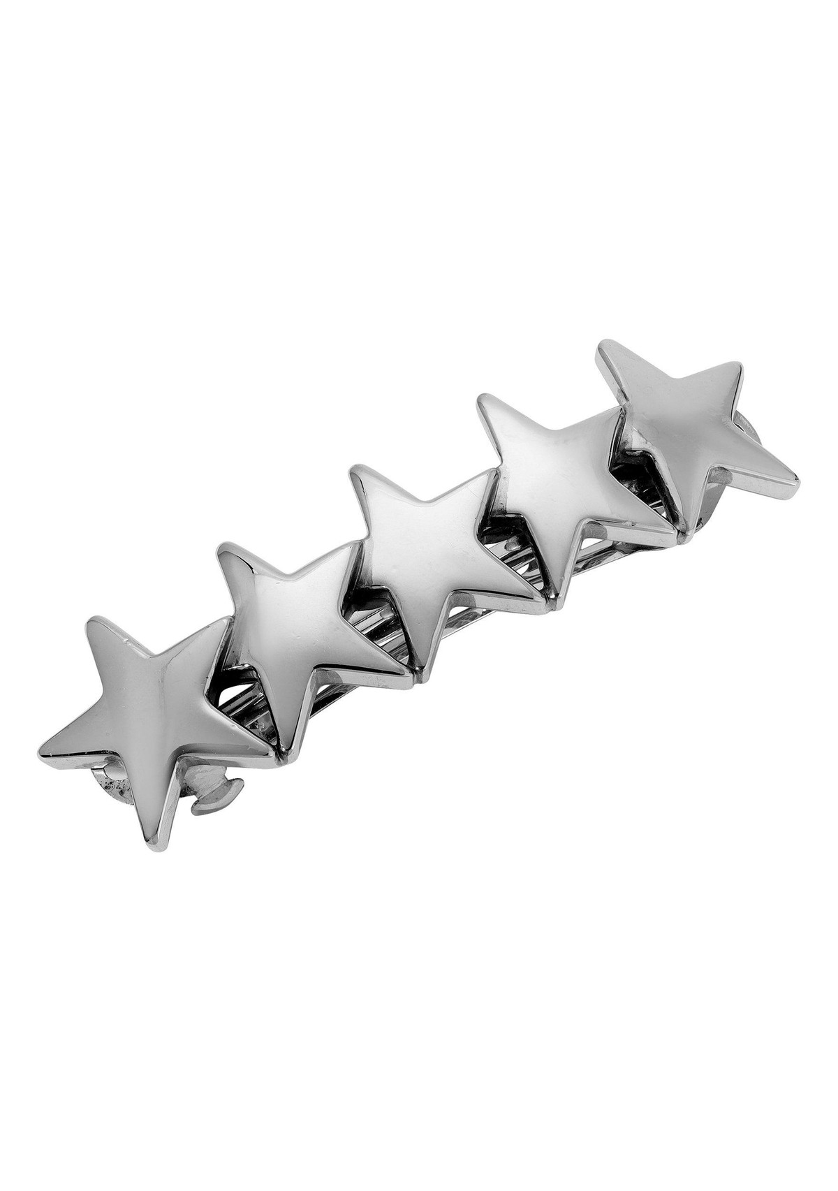This polished silver hair barrette features an elegant design of five stars, creating a chic and versatile accessory for any hairstyle. The smooth finish adds a touch of sophistication, making it suitable for both casual and formal occasions. Its durable construction ensures a secure hold. Length 2.9 in., width 20mm.