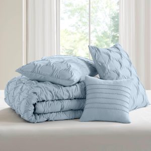 Add cozy elegance to your bedroom with this 510 Design Bailey Woven Comforter Ser. Featuring vibrant colors and ruched ogee crinkle-textured fabric, it is OEKO-TEX certified for wellness and filled with lightweight polyfill for year-round comfort. Includes a bonus 16 in. x 16 in. decorative pillow for a stylish touch.