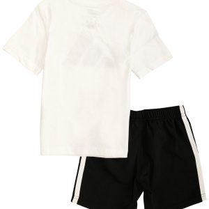 Keep him moving in comfort with this Toddler Boys Active 2 Pc Shirt Shorts Set, featuring a cotton short sleeve shirt with a logo print, paired with polyester shorts detailed with side stripes. Ideal for play, casual wear, and warm-weather activities.