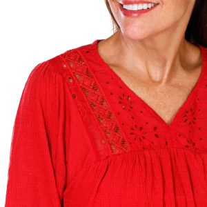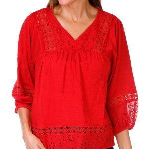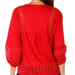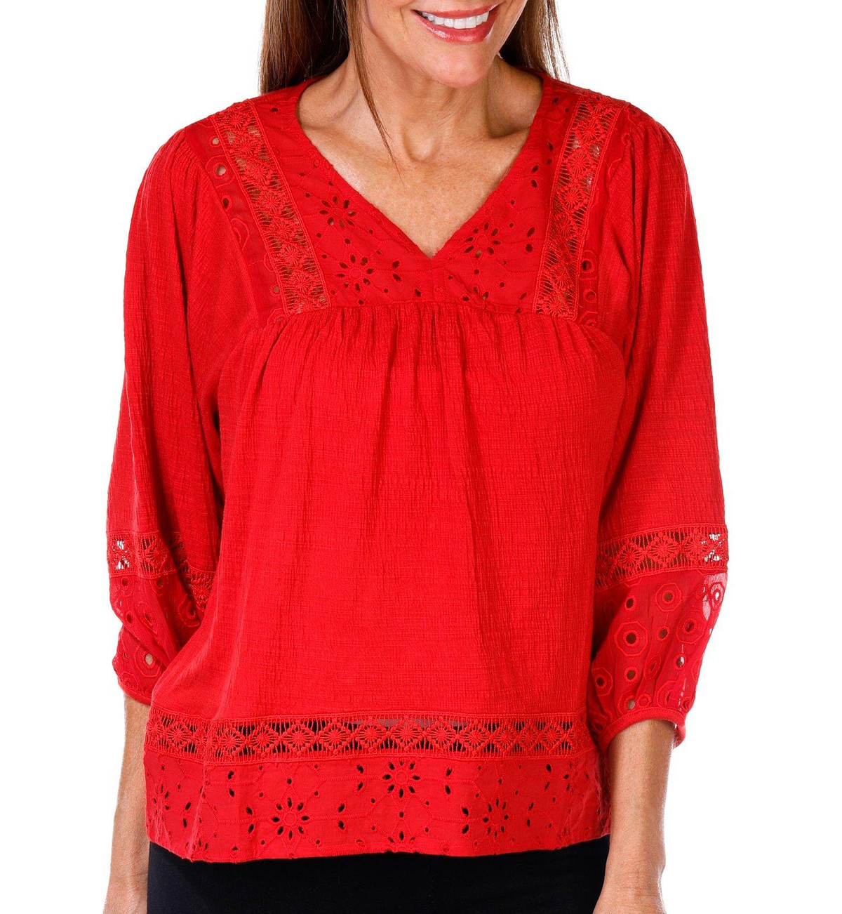 This textured knit blouse features a split neckline and delicate lace accents for added charm. Designed with 3/4 sleeves, this top offers a flattering fit and versatile style that transitions effortlessly from day to evening. Fabrication is 71% polyester, 28% rayon, and 1% spandex.