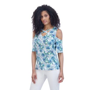 This textured knit blouse features a split neckline and delicate lace accents for added charm. Designed with 3/4 sleeves, this top offers a flattering fit and versatile style that transitions effortlessly from day to evening. Fabrication is 71% polyester, 28% rayon, and 1% spandex.