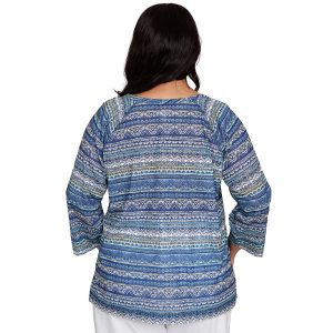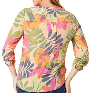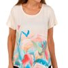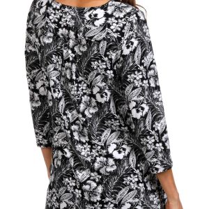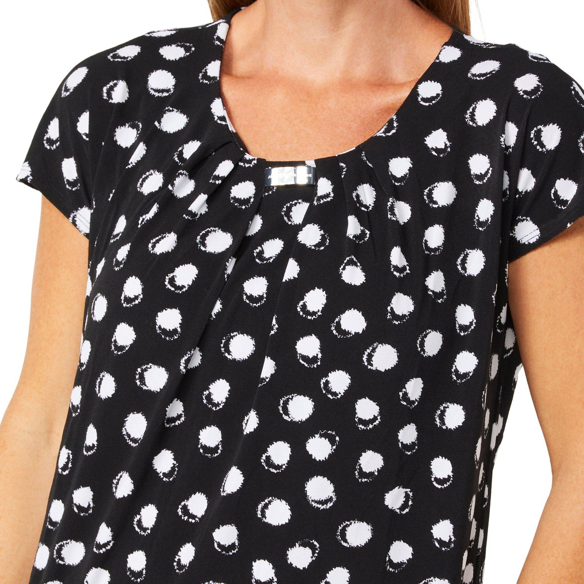 Soft and stylish, this Women’s Short Sleeve Dotted Print Top features a charming tulip print, short sleeves, and a crew neckline with pleated detail. A sleek metal accent adds a modern touch, making it perfect for both work and weekend wear. Fabrication 95% polyester, 5% spandex