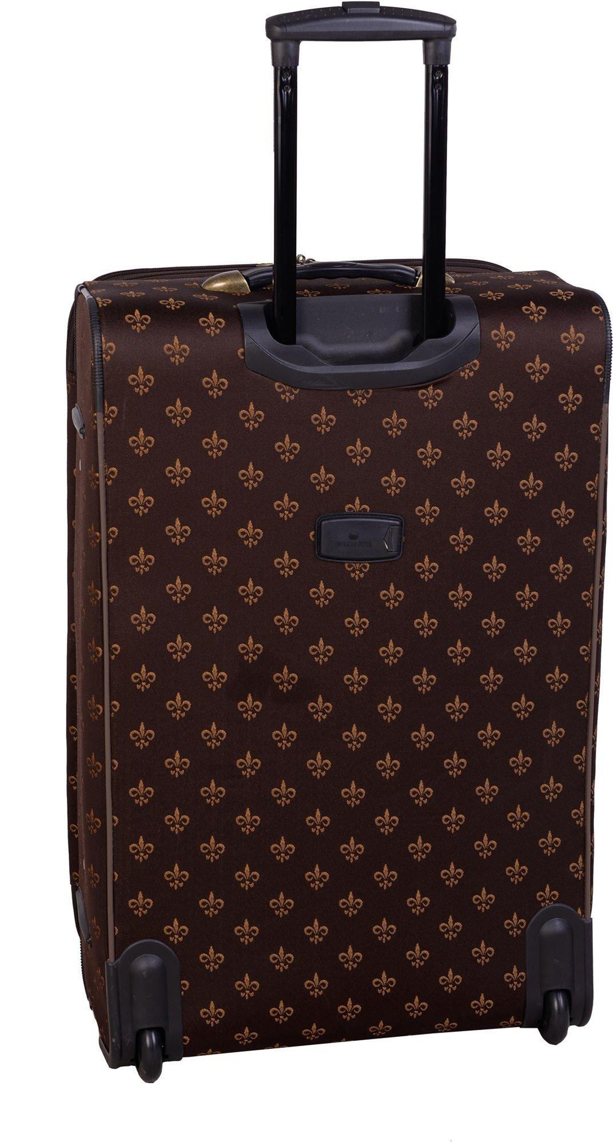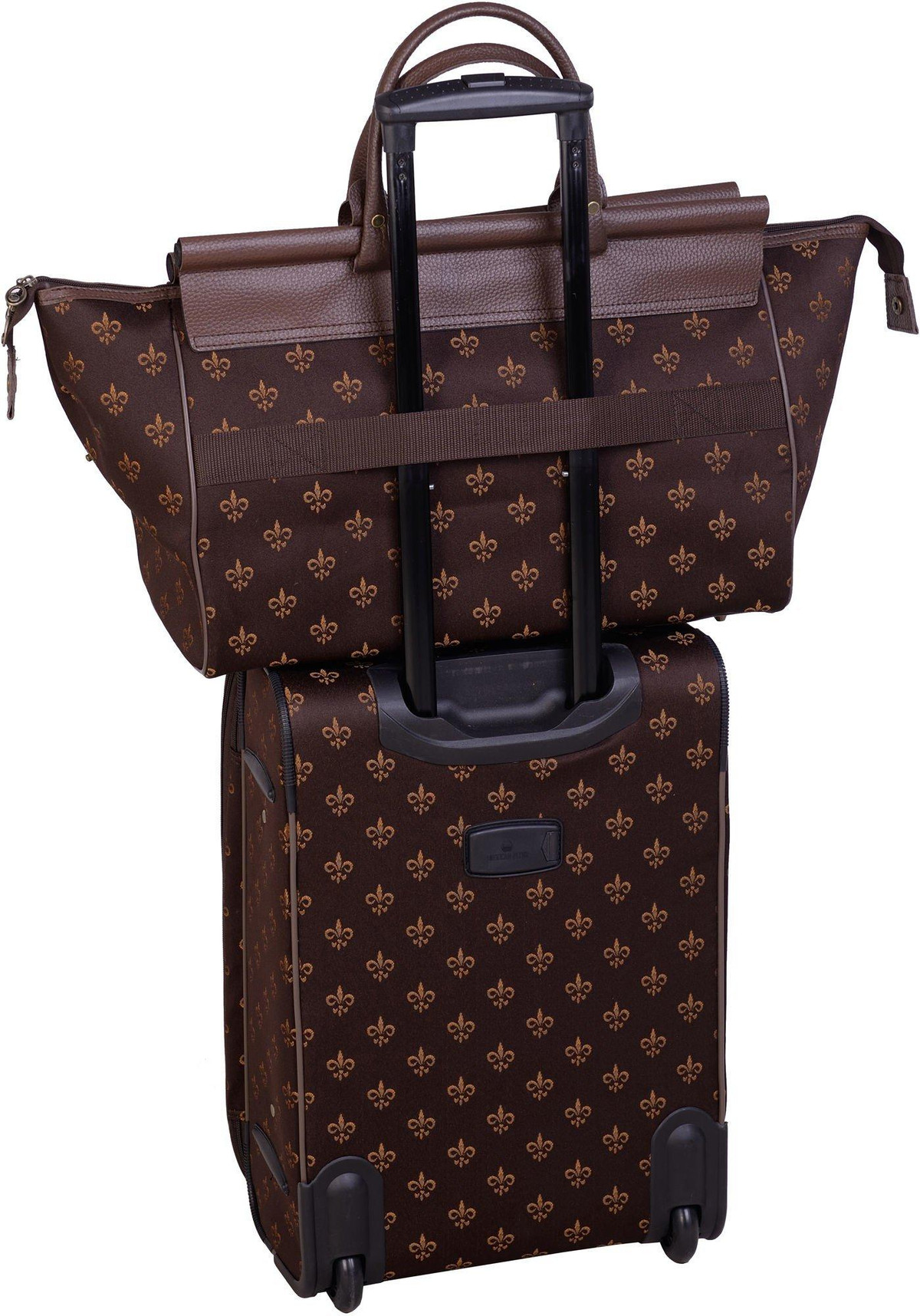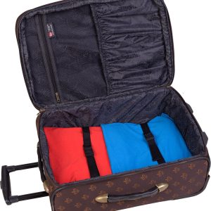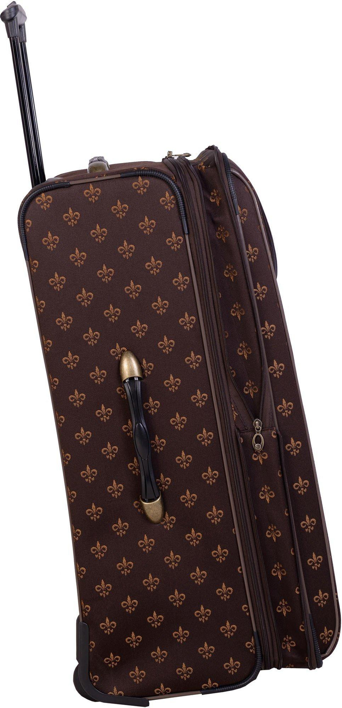 American Flyer Fleur De Lis Luggage Set includes 28” & 20” rolling expandable uprights as well as 19” doctor’s bag and cosmetic case (12” x 9”). Suitcase set features retractable telescoping handles, top & side carry handles, organizing pockets, and exterior pockets.