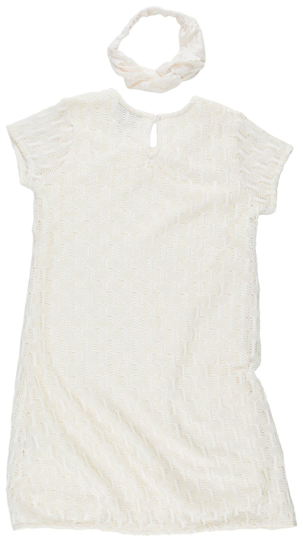 Elegant and timeless, this all-white lace dress with matching headband is perfect for special occasions. Featuring short sleeves, a round neckline, and a delicate floral embellishment, its a beautiful choice for weddings, graduations, or celebrations.
