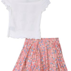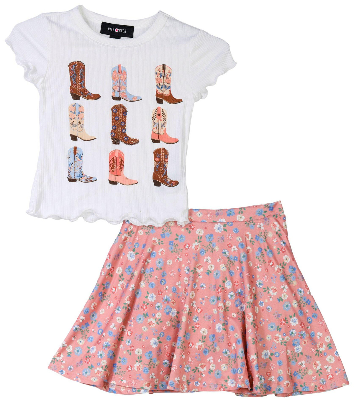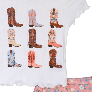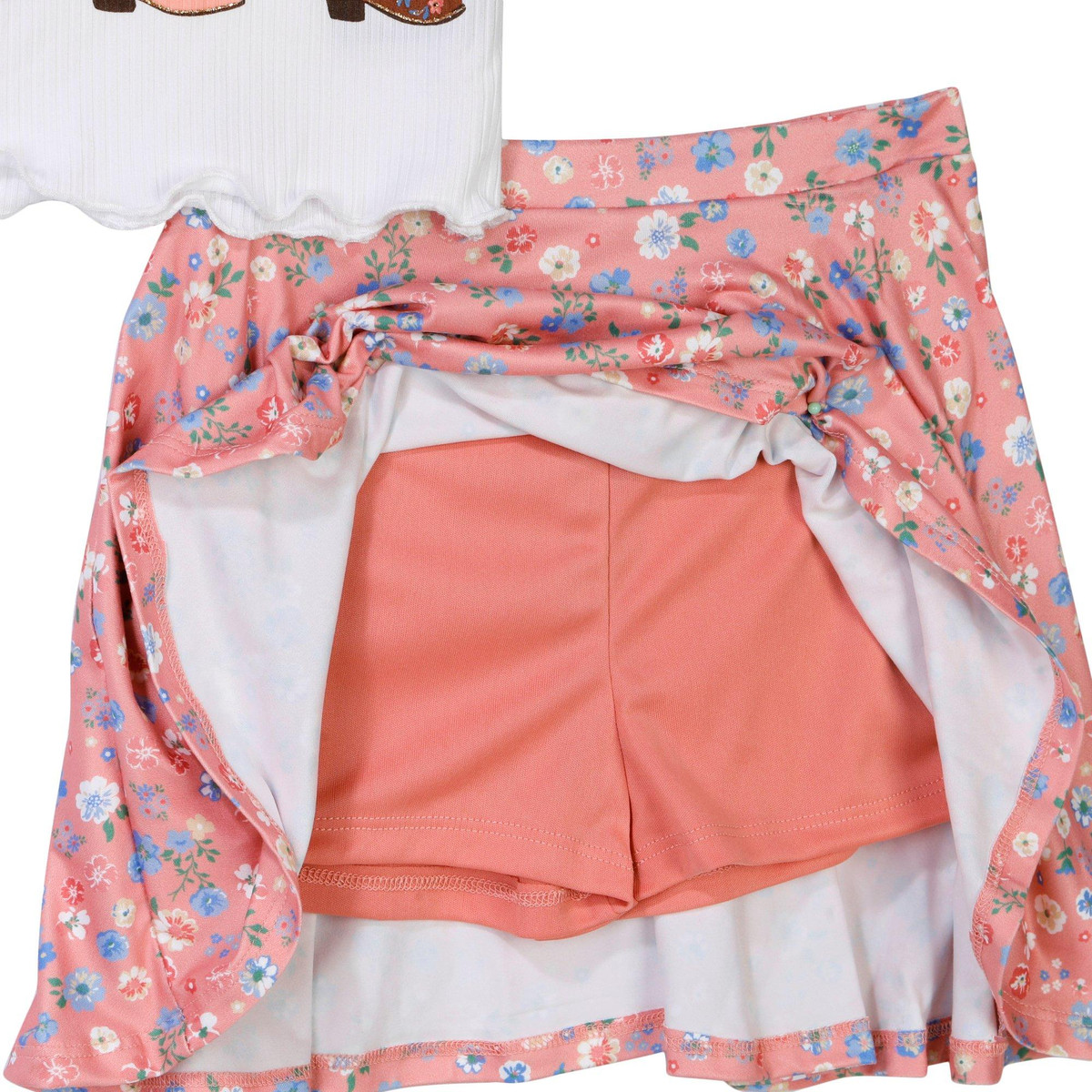 Bring western flair to her style with the Little Girls 2 pc Tee Skirt Set, featuring a graphic tee with cowboy boots print and a coordinating floral skirt. Designed for comfort with playful detail and everyday wearability. Ideal for casual outings, school days, and seasonal events.
