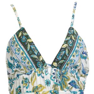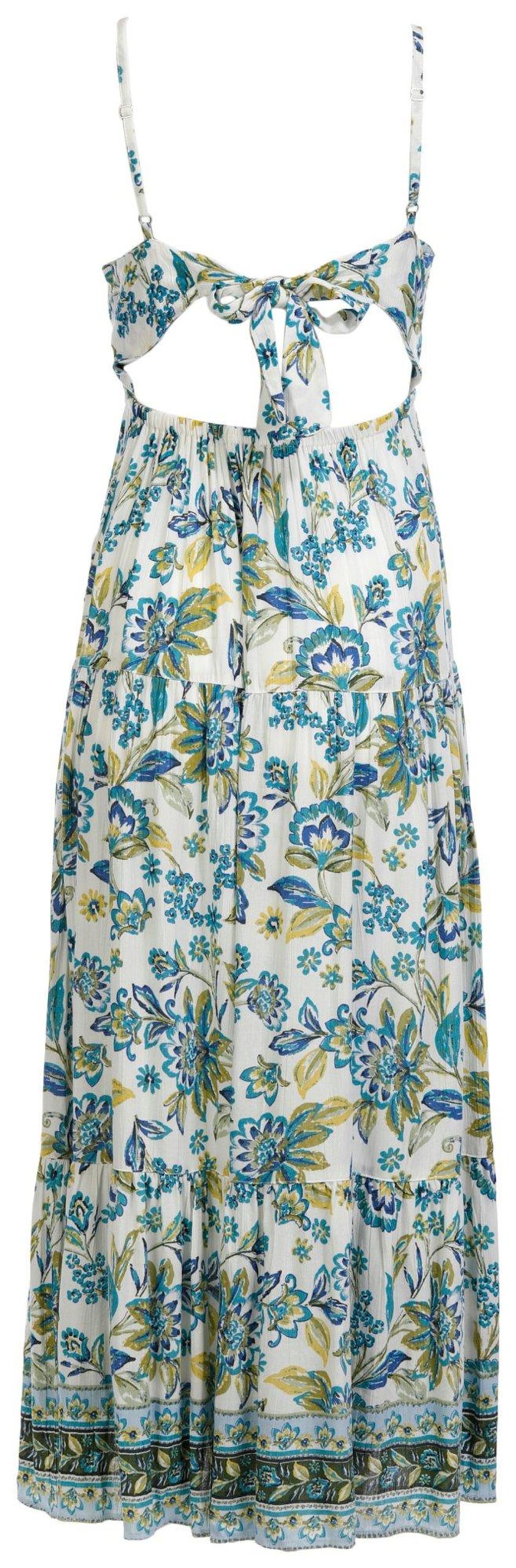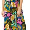 This sleeveless maxi dress features a stylish palm print on lightweight fabric, a v-neckline, front knotted detail, back pleated details, adjustable straps, a ruffled hemline, and a relaxed fit. The length measures approximately 55 in. Fabrication is 100% rayon.