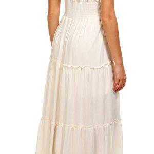 This sleeveless maxi dress features a stylish palm print on lightweight fabric, a v-neckline, front knotted detail, back pleated details, adjustable straps, a ruffled hemline, and a relaxed fit. The length measures approximately 55 in. Fabrication is 100% rayon.