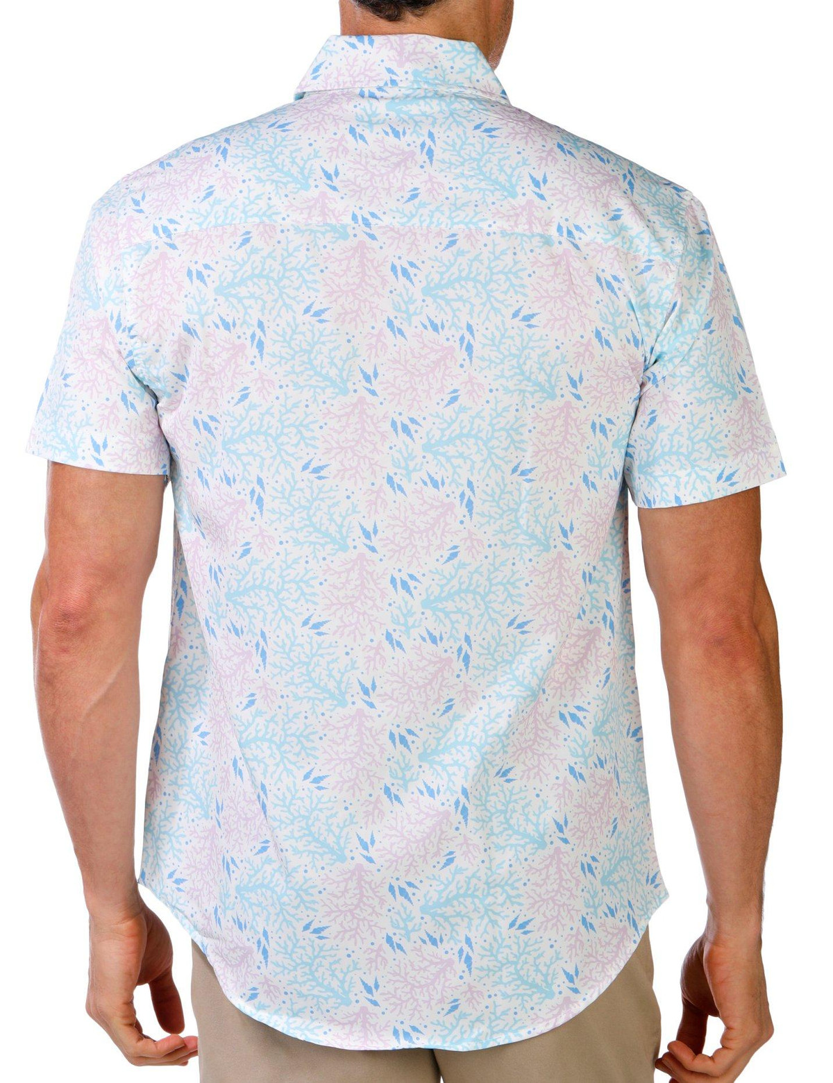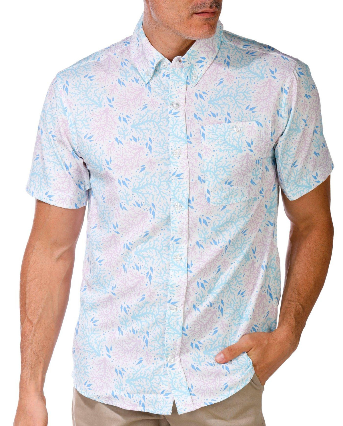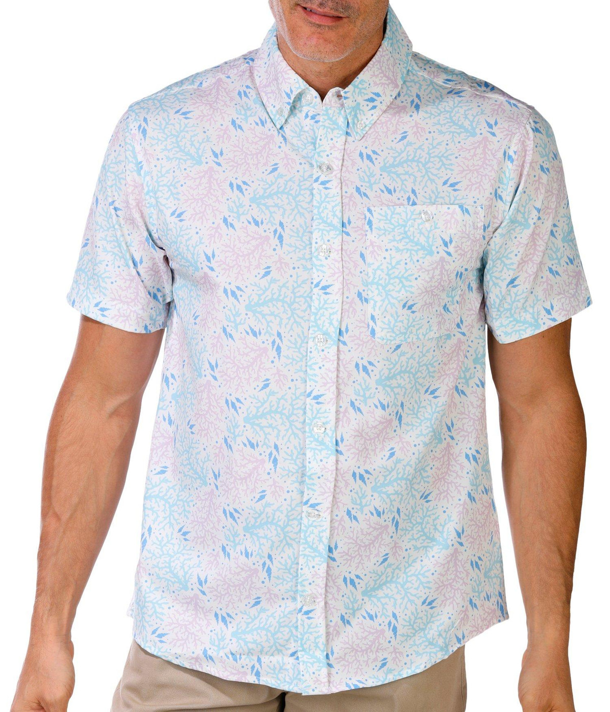 Explore in style with the Men’s Short Sleeve Coral Button Down Shirt. Featuring a sea coral graphic print, button-down front, and chest slip pocket, its crafted from breathable, stretchy fabric with built-in sun protection. Fabrication 90% polyester, 10% spandex