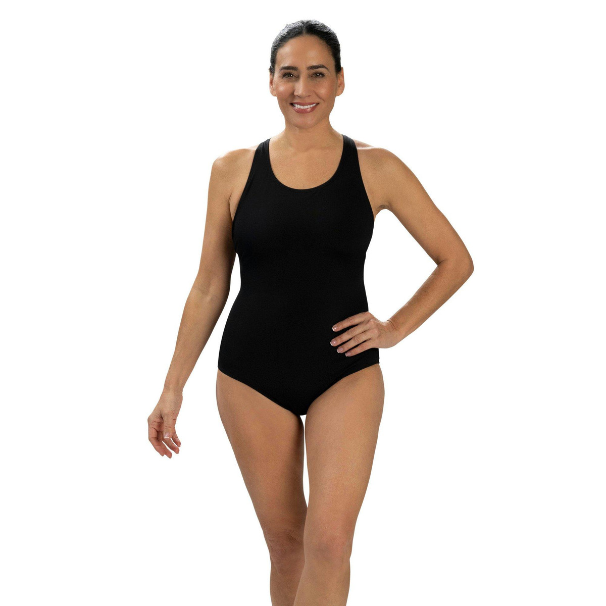Ready for sun and swim? This comfy one-piece has you covered! Made from quick-dry polyester, it is chlorine-resistant with UPF 50+ protection. The scoop neck and back keep things easy, while the modest leg cut and shelf bra offer support and coverage. Dive in and make a splash. Your new favorite suit is waiting!