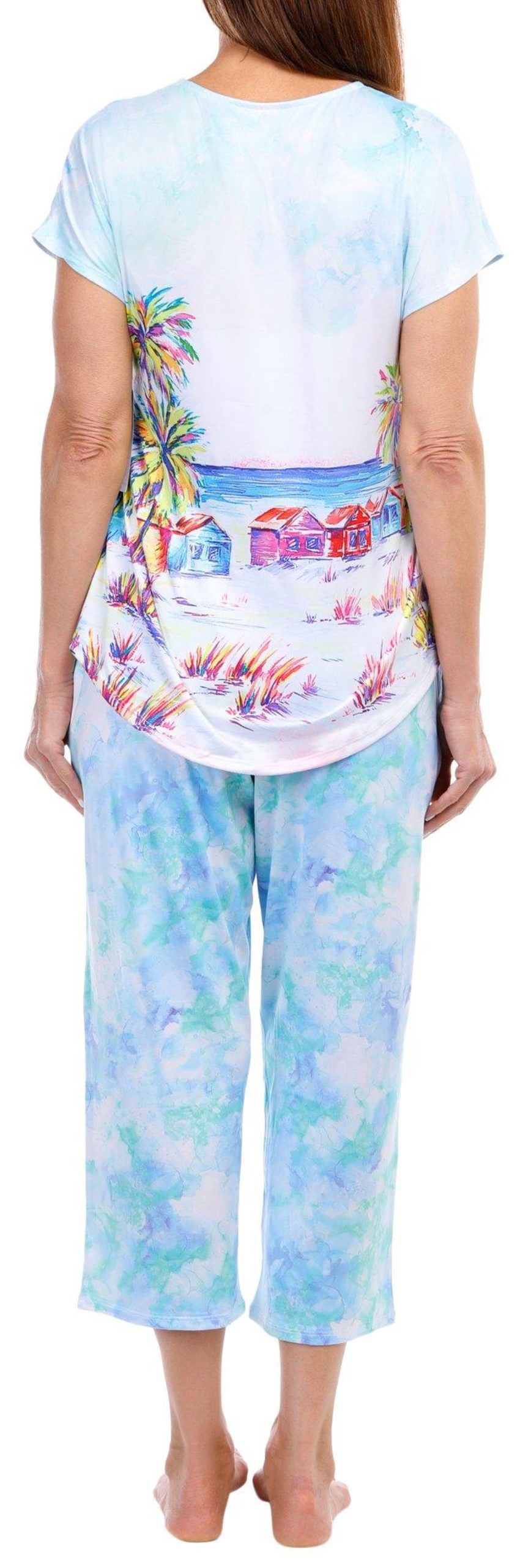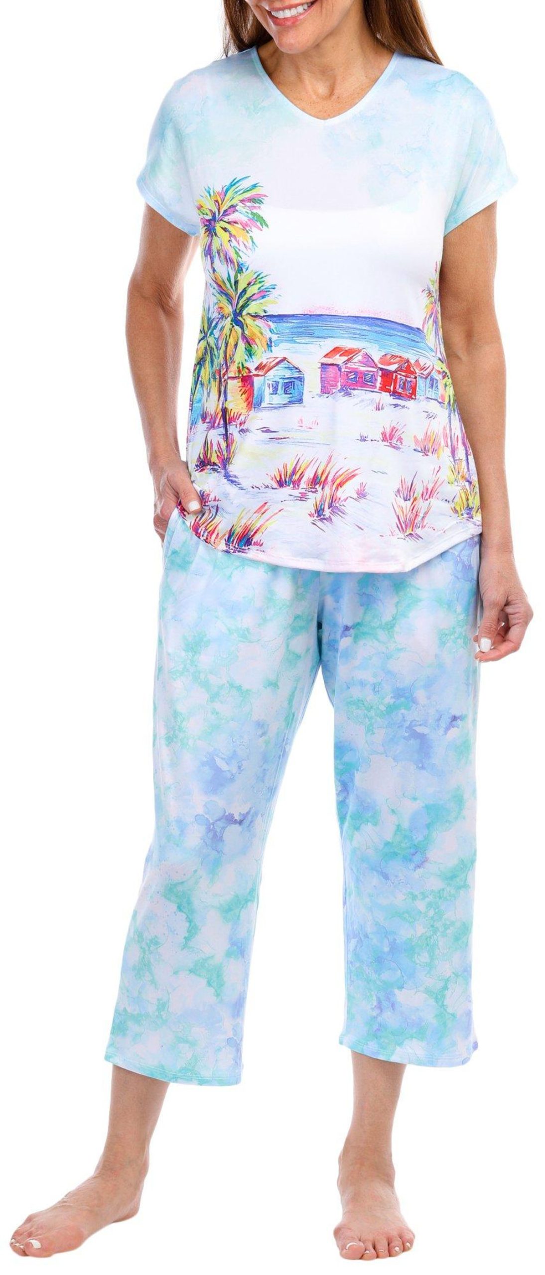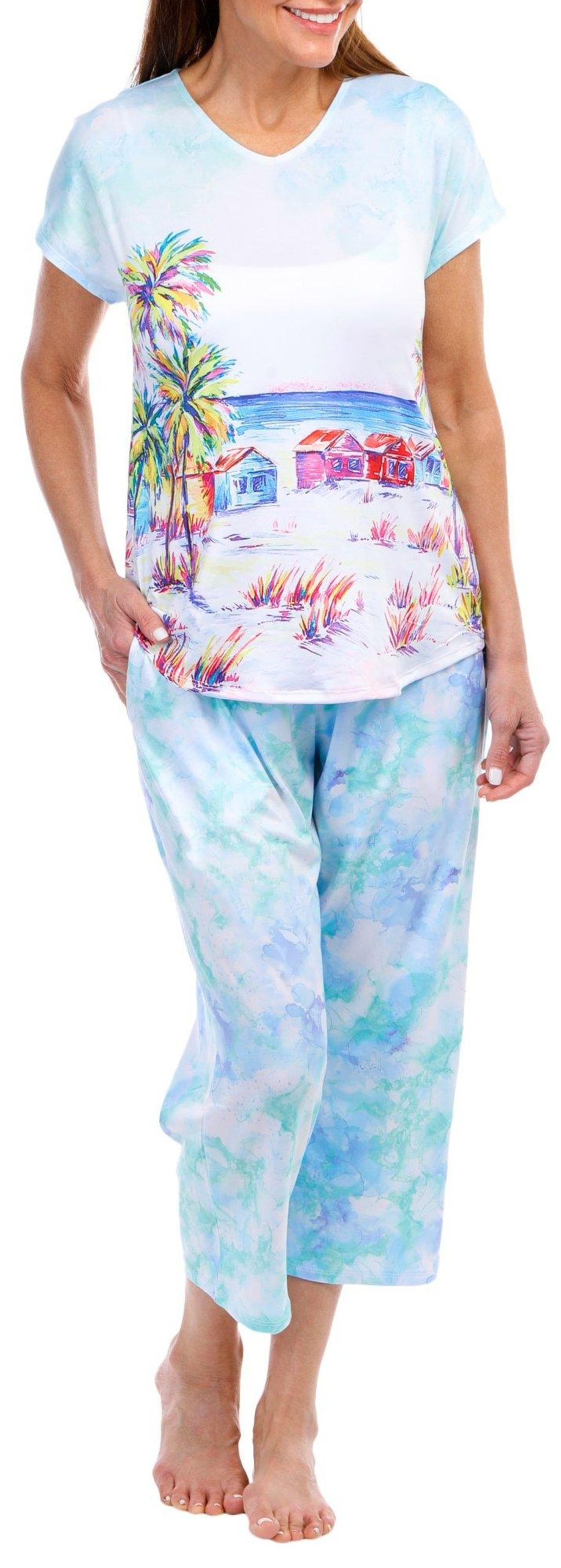 Drift to sleep with our 2-piece Short Sleeve Sleepwear Set. This charming set includes a short sleeve top and drawstring capris, both adorned with a colorful Key West Scene print. The soft, breathable fabric ensures a comfortable night’s sleep, while the playful design adds a touch of fun to your bedtime routine. Perfect for warm nights or lounging at home, this sleepwear set combines style and comfort for a great addition to your nighttime wardrobe. Fabrication is 97% polyester and 3% spandex.