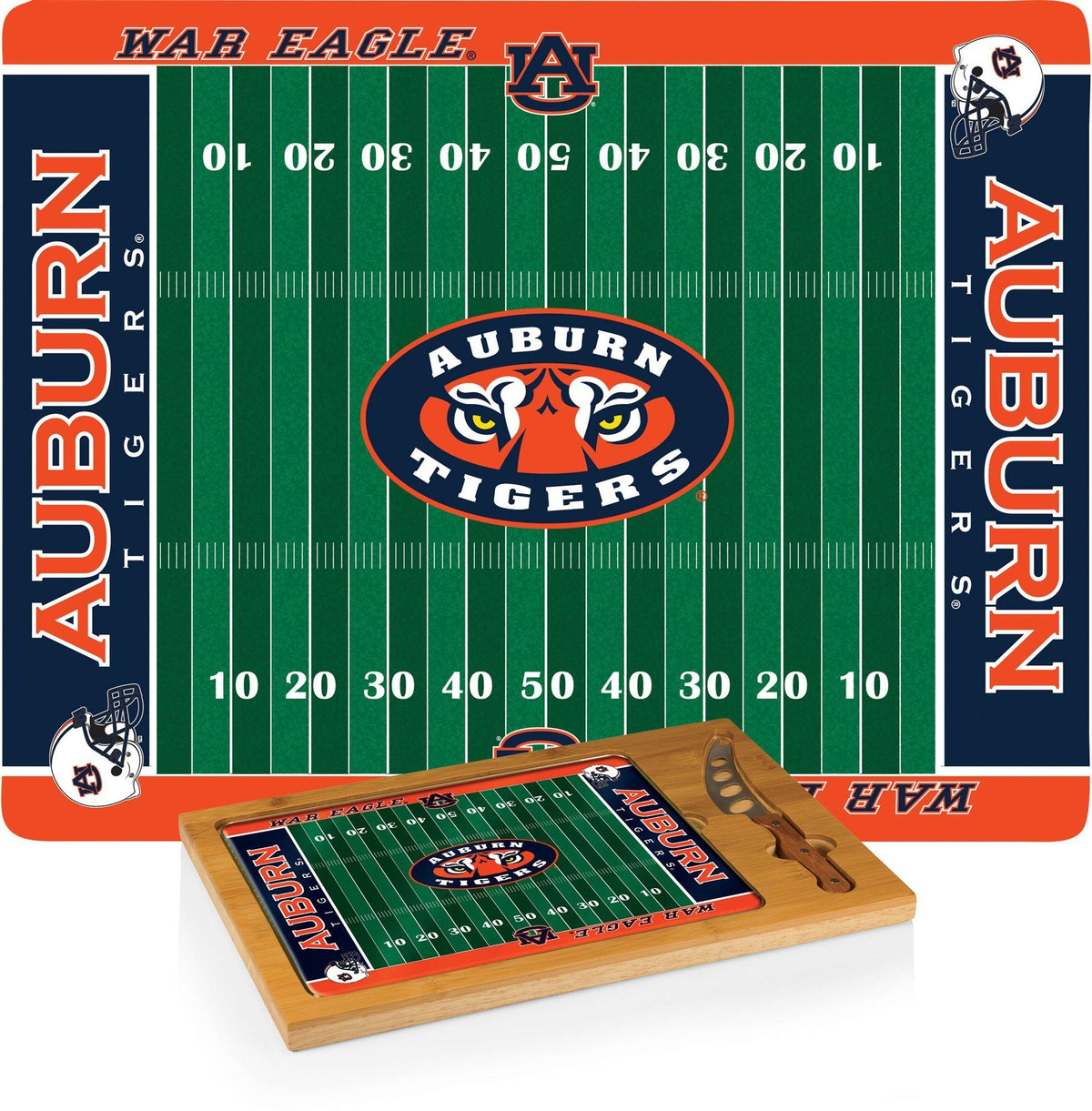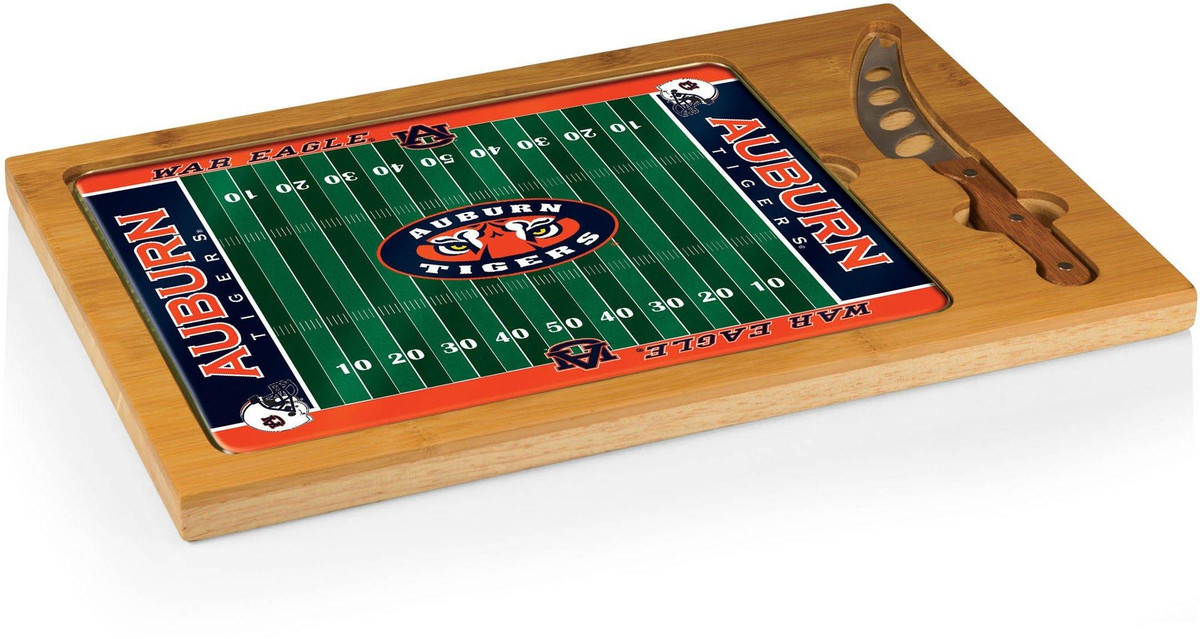 The Icon Auburn Tigers Cutting Board is a 3-pc. set that has a solid rubberwood base with a bamboo rim accent, a tempered glass lid, & a cheese knife with its own carved out area in the wood base. Measures 15.2”L x 10”W x .8”H.