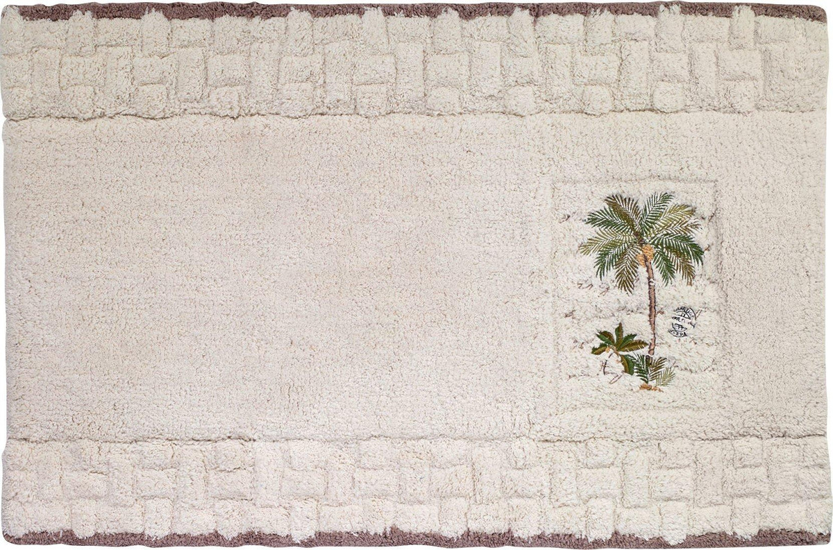 The Colony Palm bath rug is 100% cotton and features a beautiful, green embroidered palm in an ivory background accented with a basket weave sculpted top and bottom. Measures: 20” x 30”.