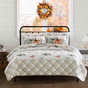 The Avanti Grateful Patch Quilt Set features a beautiful harvest scene with pumpkins and leaves, and a linen and white plaid border on an ivory background. Printed on and filled with 100% polyester with a box-stitch quilting pattern. 100% polyester.