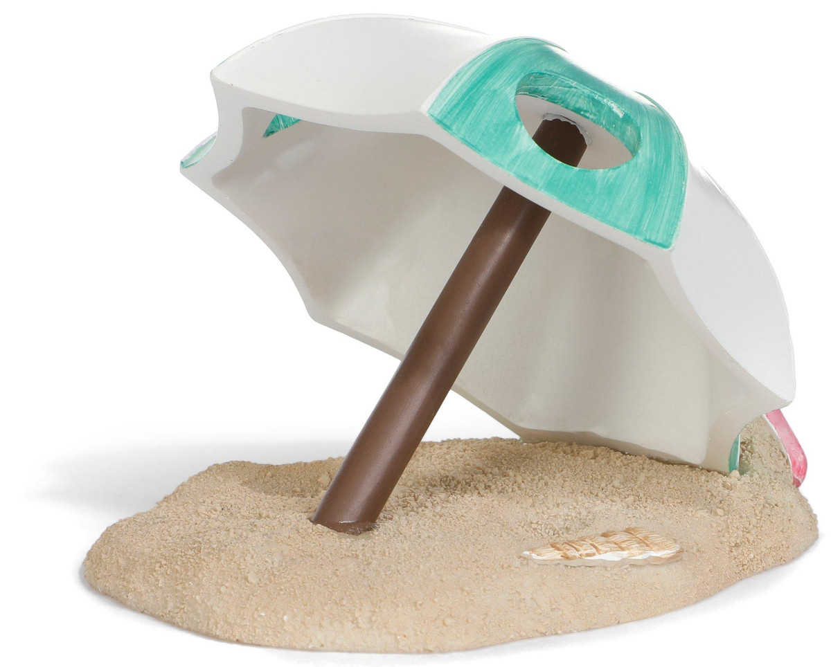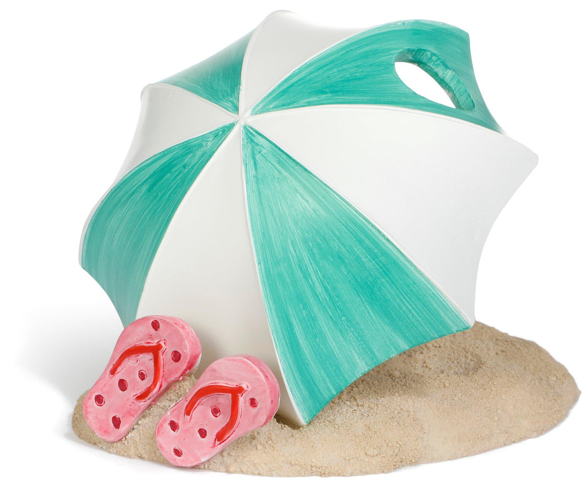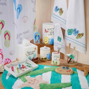 The Avanti Beach Mode Collection Toothbrush Holder adds a coastal touch with its green and white umbrella set in a sand base, featuring pink flip-flops and a fan shell. Crafted from durable, hand-painted resin, it holds up to four toothbrushes while complementing beach-inspired décor. Complete the look with matching accessories. You can find more details Measures 4.25 in. L x 4.25 in. W x 5.0 in. H