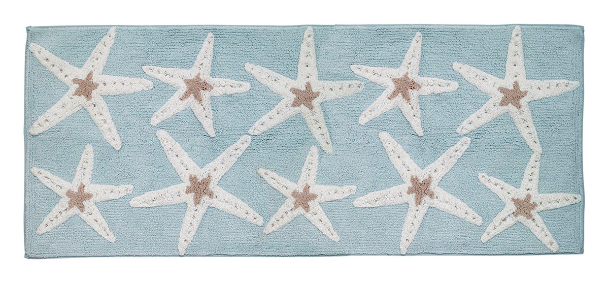 Bring a bit of the shore indoor and go totally beach chic in your bathroom or kitchen with the Sequin Shells from Avanti. The oversized rug features starfish on an aqua ground tufted in 100% cotton. The rug is skid resistant and machine washable. Measures 24 in x 60 in.