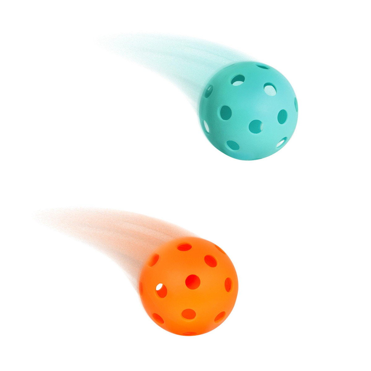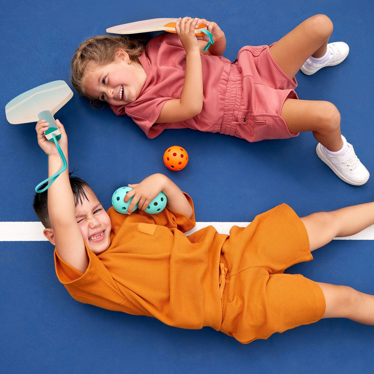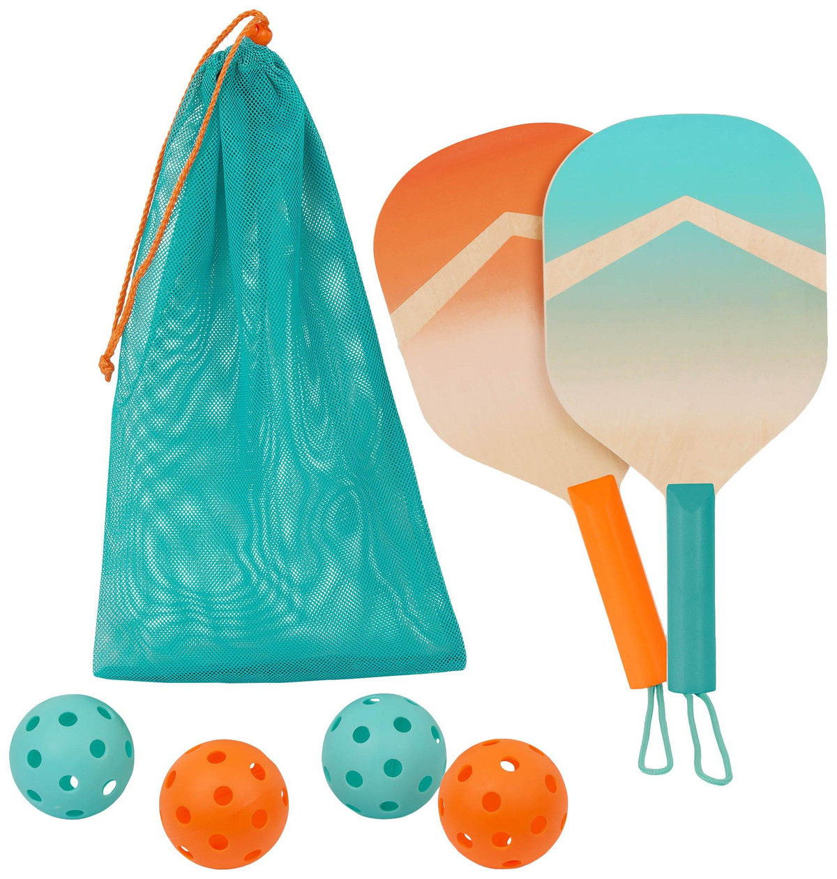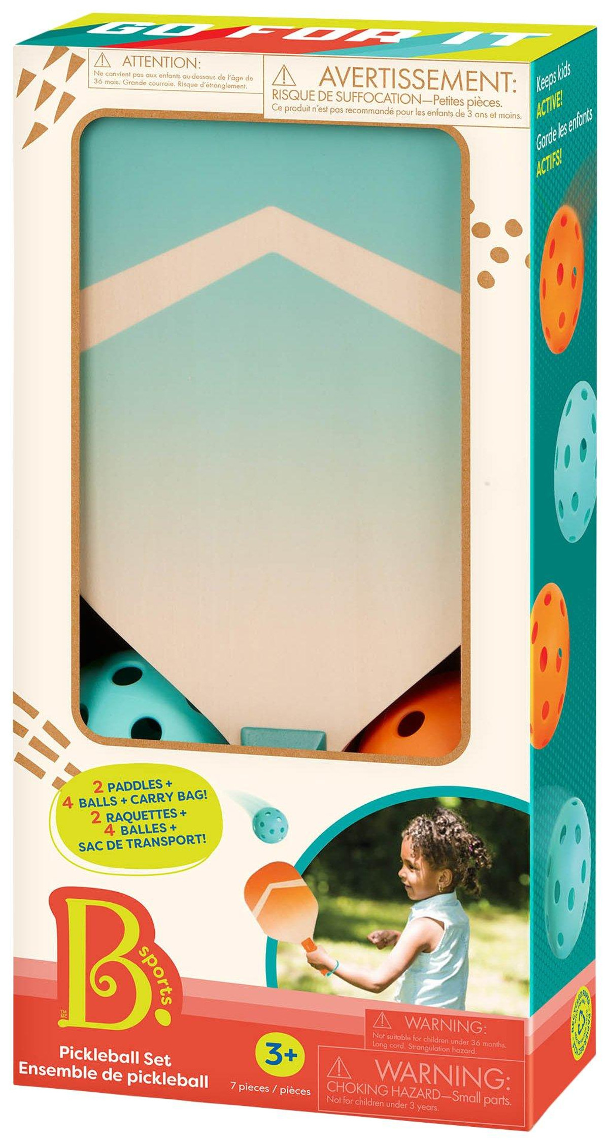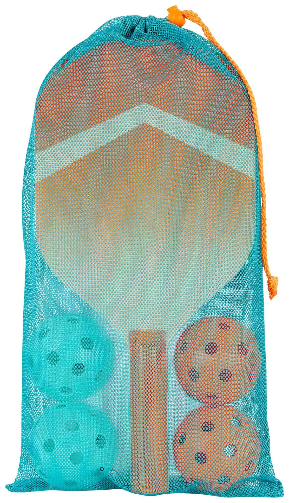 Grab a paddle get ready to serve up some pickleball a sport for all ages! This set features 2 paddles with easy-grip handles and 4 balls in two fun colors. Ages 3+.