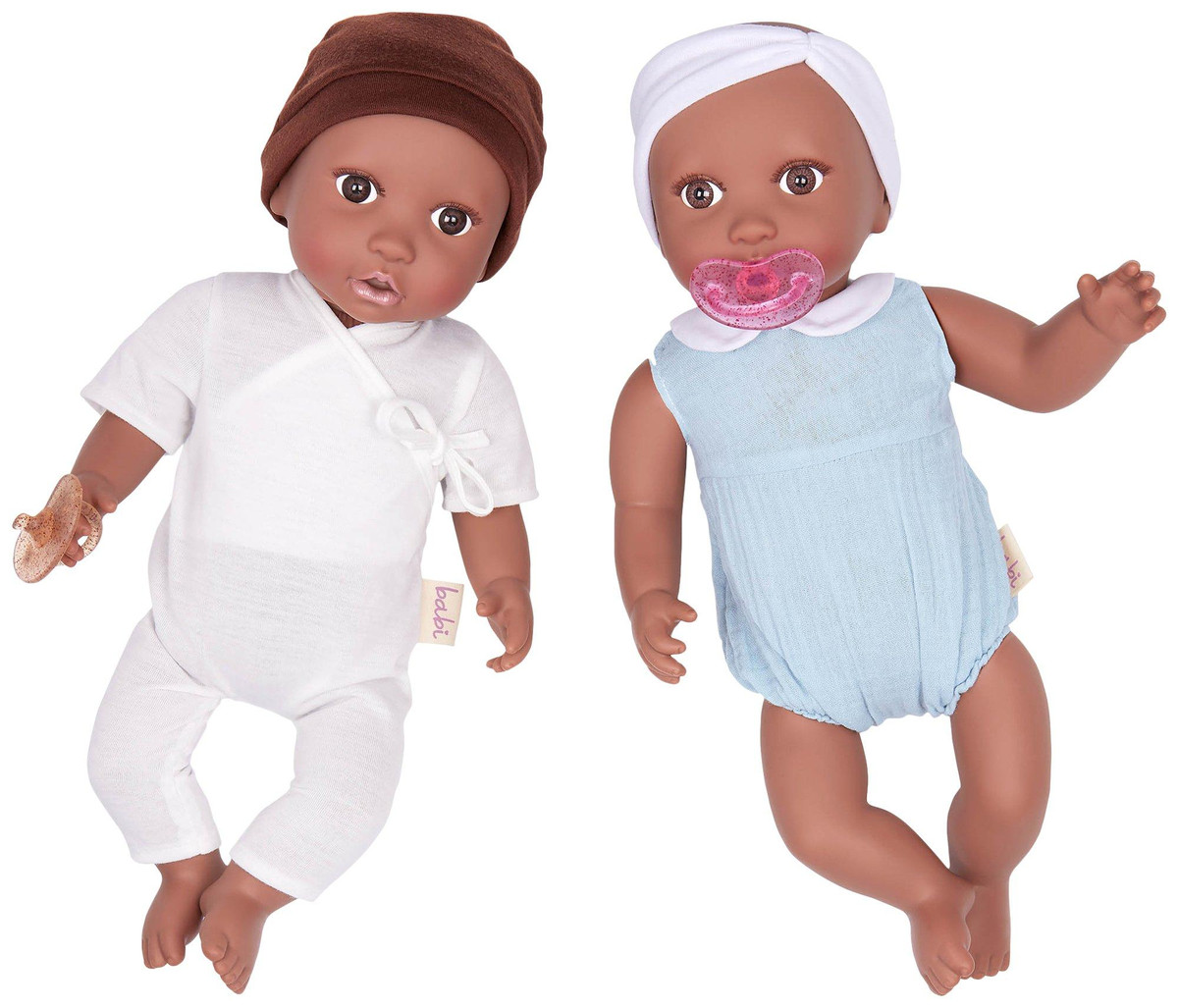 Nurturing play by Babi by Battat inspires compassion, kindness, and nurturing qualities the more children play and care for their babi dolls. These two dolls feature fixed-open, bright brown eyes, soft eyelashes, realistic face, hands, and feet, and huggable soft body to cuddle. Age: ages 3+ (small parts); perfect height for small hands, easy to clean, and durable for everyday play. Includes: babis are nestled in a lovely outfit with a matching pink headband and a removable pacifier accessory.