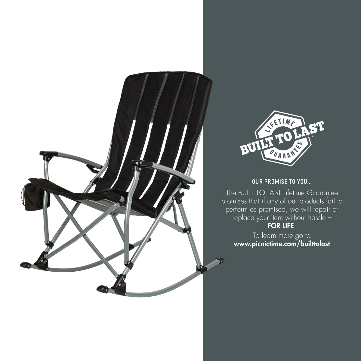 The BALTIMORE RAVENS Outdoor Rocking Chair is the a fan favorate at tailgates and backyard BBQs. Folding rocking chair with mesh cup holder in armrest; Includes carrying bag; Made of 600D PVC with steel frame; Includes: 1 Outdoor Rocking Chair, 1 Drawstring Carrying Bag with Shoulder Strap. Dimensions: 28 x 35.8 x 40.5. Weight limit 250 LBS.