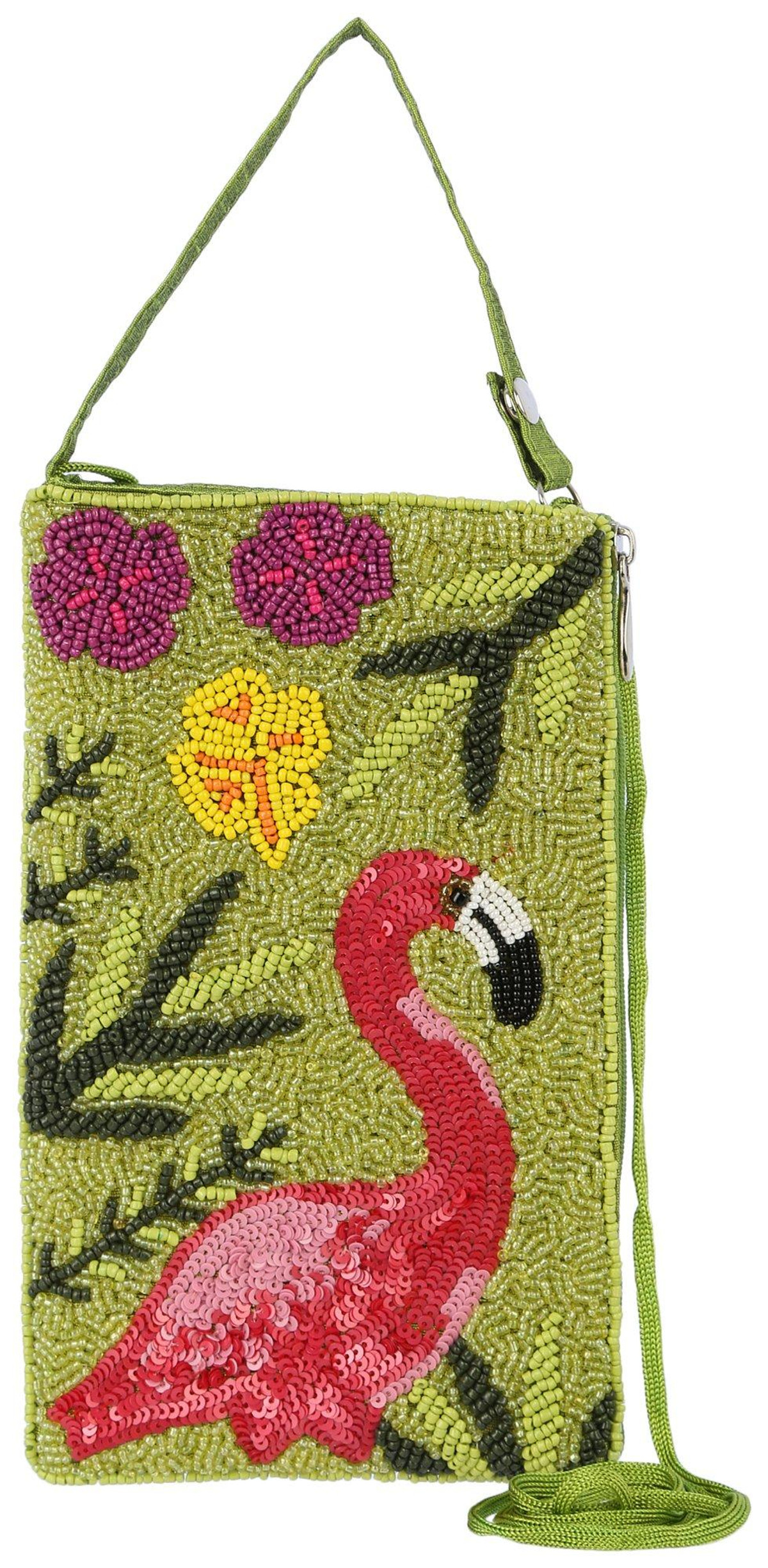 Keep your valuables nearby and stylish in this colorful wristlet! It features a bright design composed of colorful beads, wristlet strap and cord shoulder strap, a fully zipped top, and a slip main compartment. Measures approximately 5 in x 8 in.