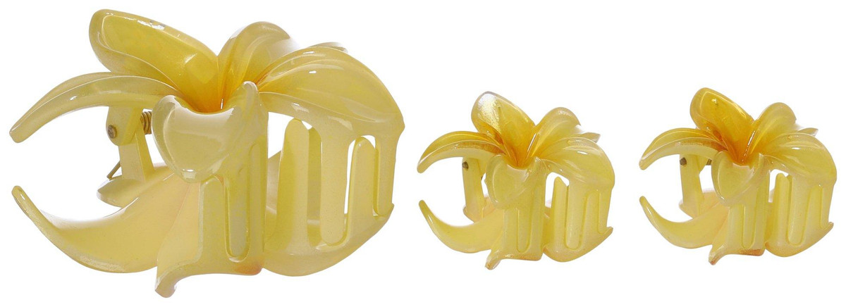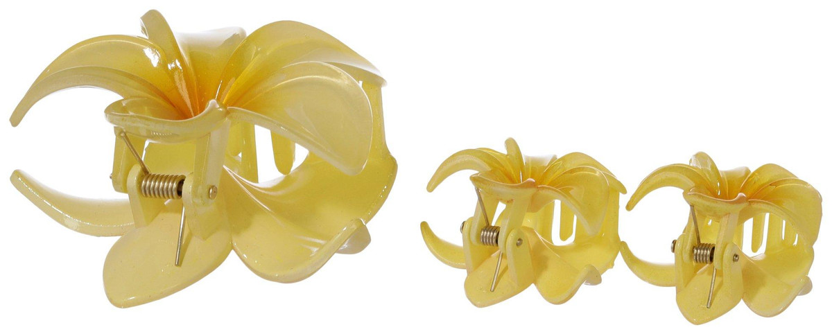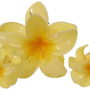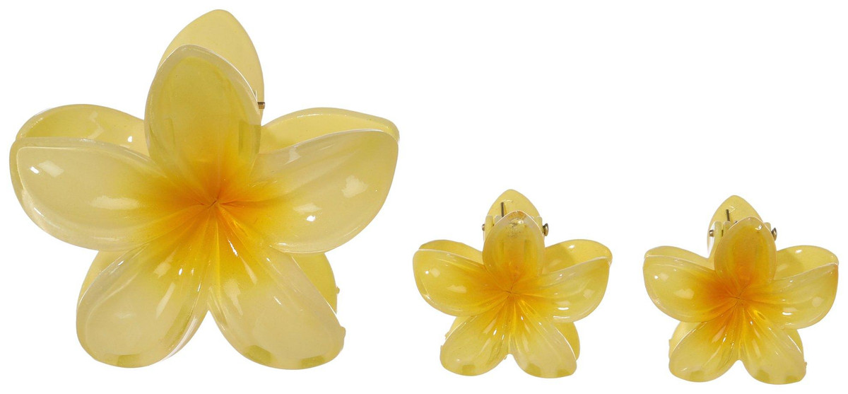 Add a cheerful pop of color to your hairstyle with this pack of three yellow flower-shaped hair clips. Featuring one medium-sized clip and two smaller ones, this set offers a playful and balanced look. Designed for a secure hold and easy styling, they are perfect for brightening up everyday outfits or adding a fun touch to special occasions.