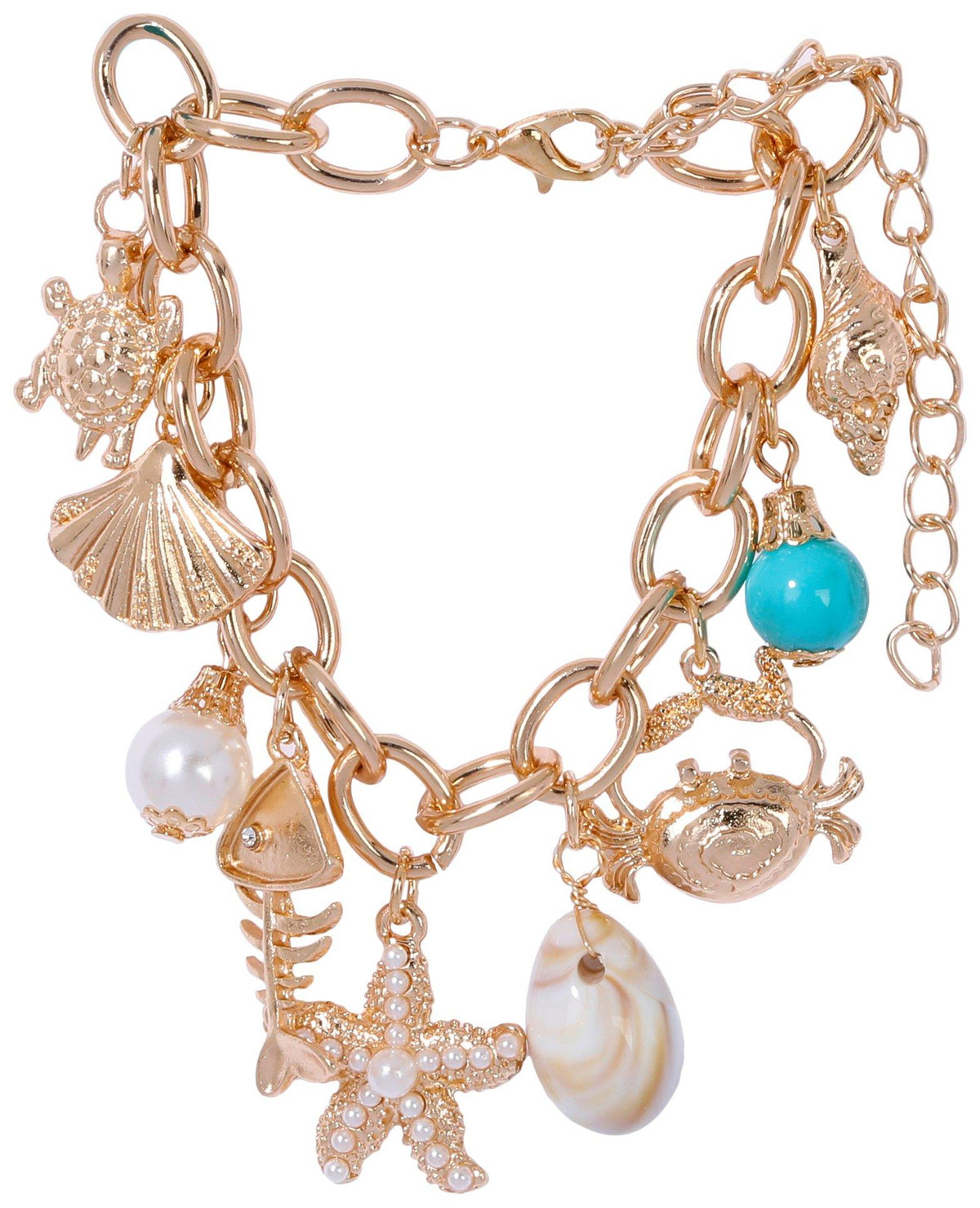 Gold-Tone Ocean Charm Bracelet Celebrate seaside style with this playful gold-tone bracelet adorned with ocean-inspired charms including a starfish, crab, shells, fishbone, faux pearl, and turquoise bead. A fun, whimsical accessory perfect for beach days or summer getaways.
