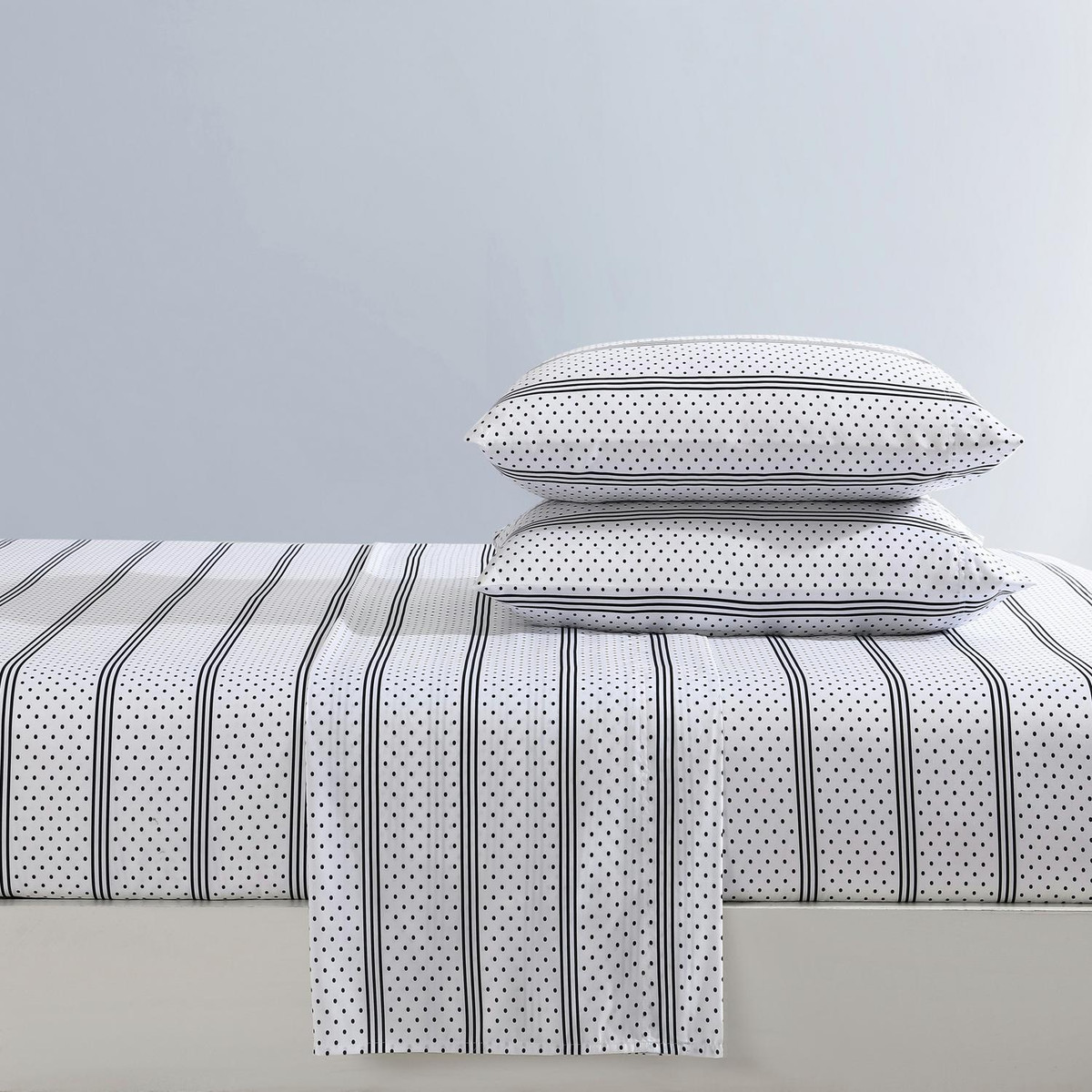 Brighten your bed with Betsey Johnsons Dots and Stripes Sheet Set! Made from ultra-soft microfiber, these sheets are fade, stain, and wrinkle resistant, perfect for everyday flair. With playful patterns from skulls to florals, they bring Betseys bold style to life. Mix and match with a Betsey comforter for the full look! Machine washable for easy care.