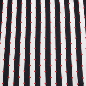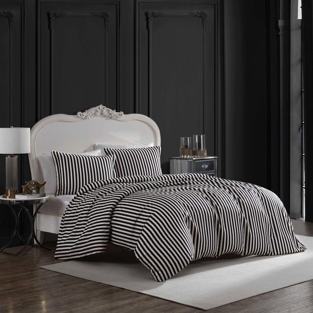Make a bold, romantic statement with the Betsey Johnson Wonderland Stripe Duvet Cover Set. Featuring striking black-and-white stripes with playful red hearts, this ultra-soft polyester set adds drama and charm. Lightweight for year-round comfort, it includes a duvet cover with a zip closure, corner ties, and matching shams for a chic, polished look. Machine washable for easy care.