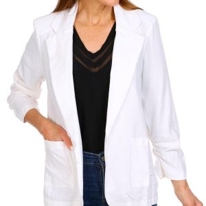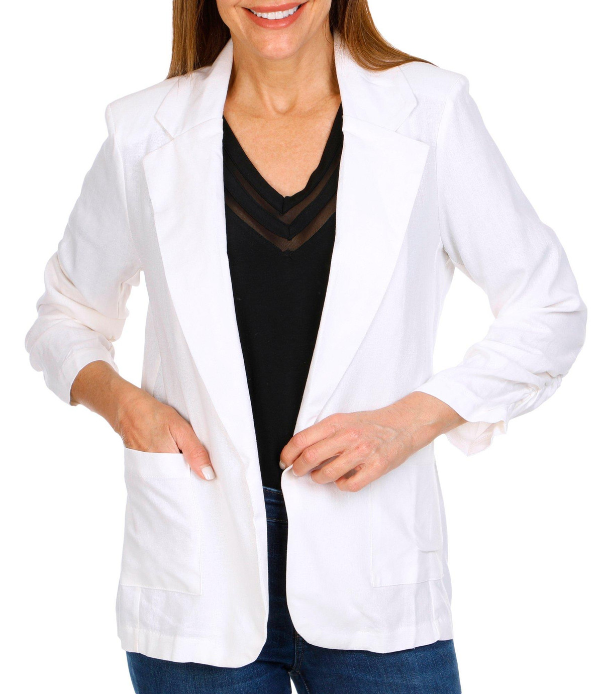 Step up your style game with our Solid Long Sleeve Blazer Jacket. This sophisticated piece features patch pockets for a touch of practicality, while the ruched sleeve details add a modern twist. The padded shoulders provide a structured silhouette, ensuring you look sharp and confident. Perfect for both professional and casual settings, this blazer is a versatile addition to your wardrobe. Fabrication is 80% rayon and 20% linen.