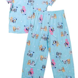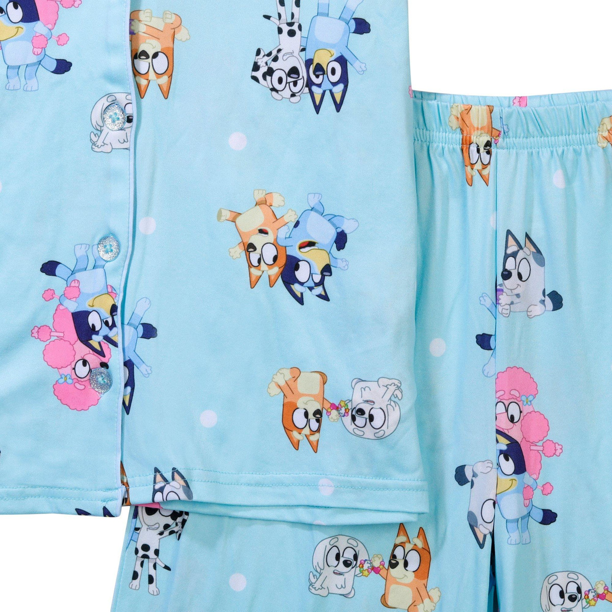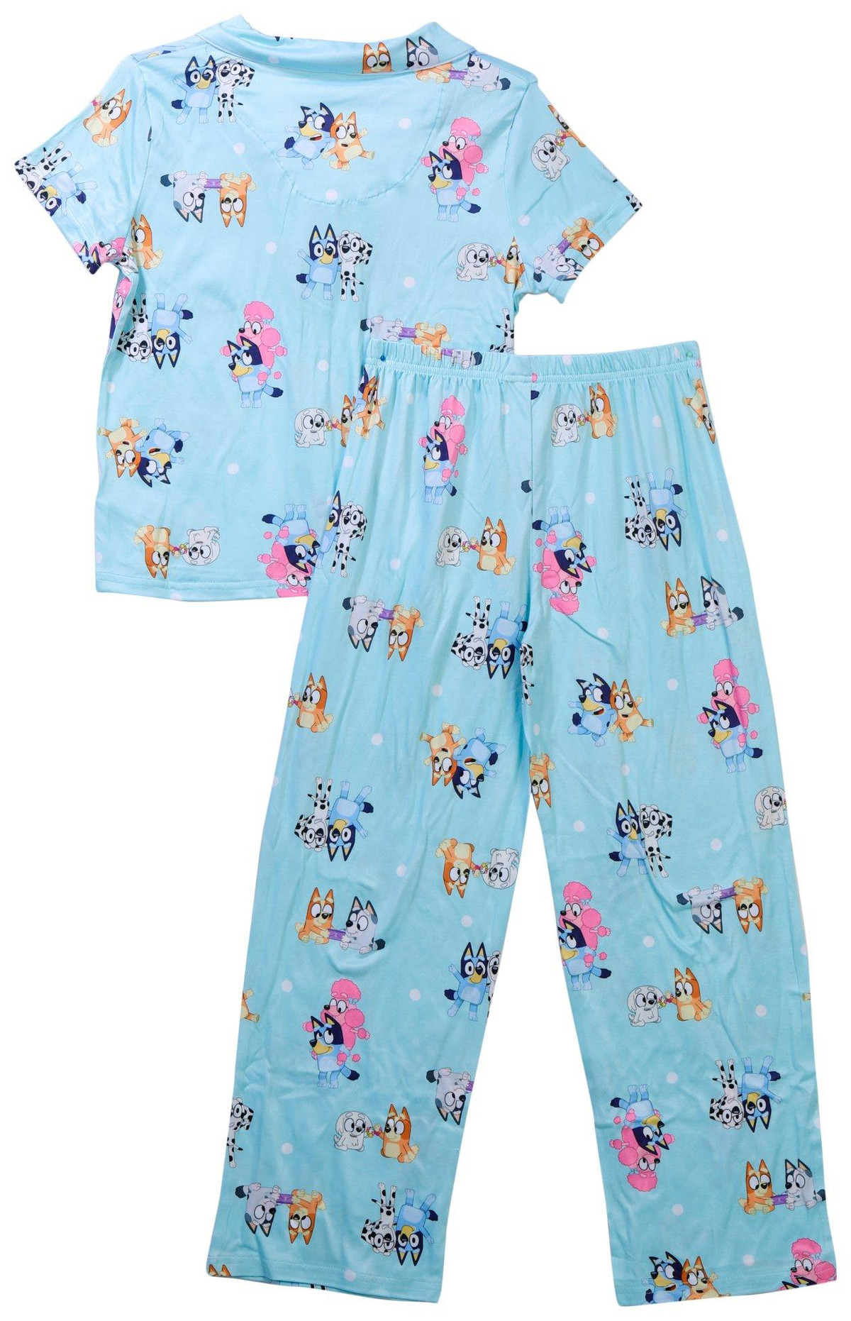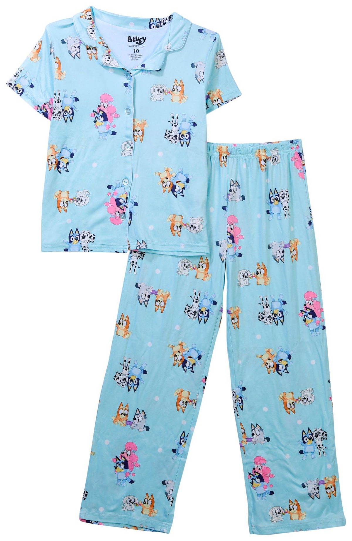 The Girls 2 Pc Bluey Pajama Pants Set is a cozy bedtime favorite featuring a short sleeve button down top and matching pants. Both pieces are adorned with a playful Bluey graphic print, making it a fun and comfy choice for fans of the beloved character. Fabrication 95% polyester, 5% spandex
