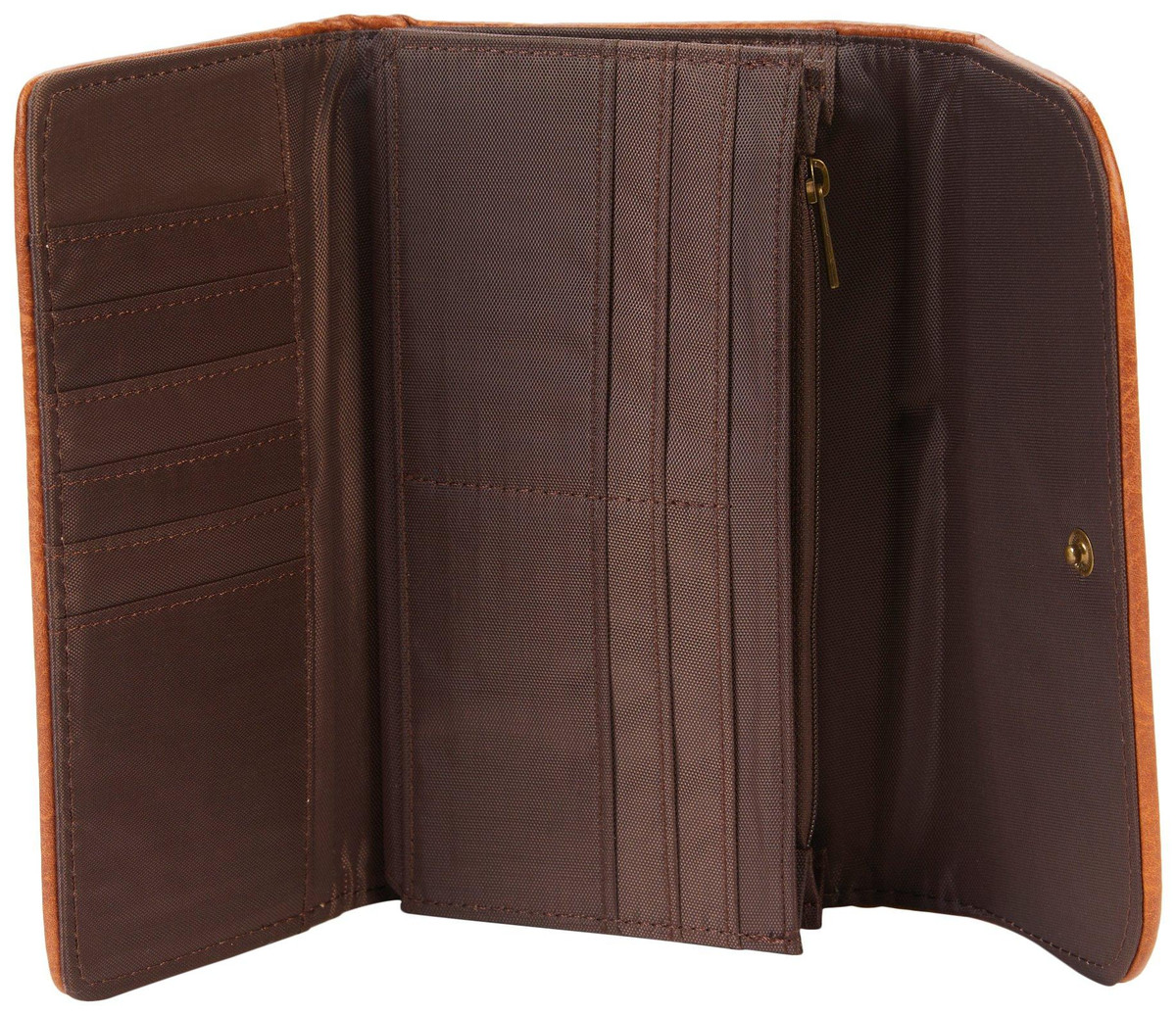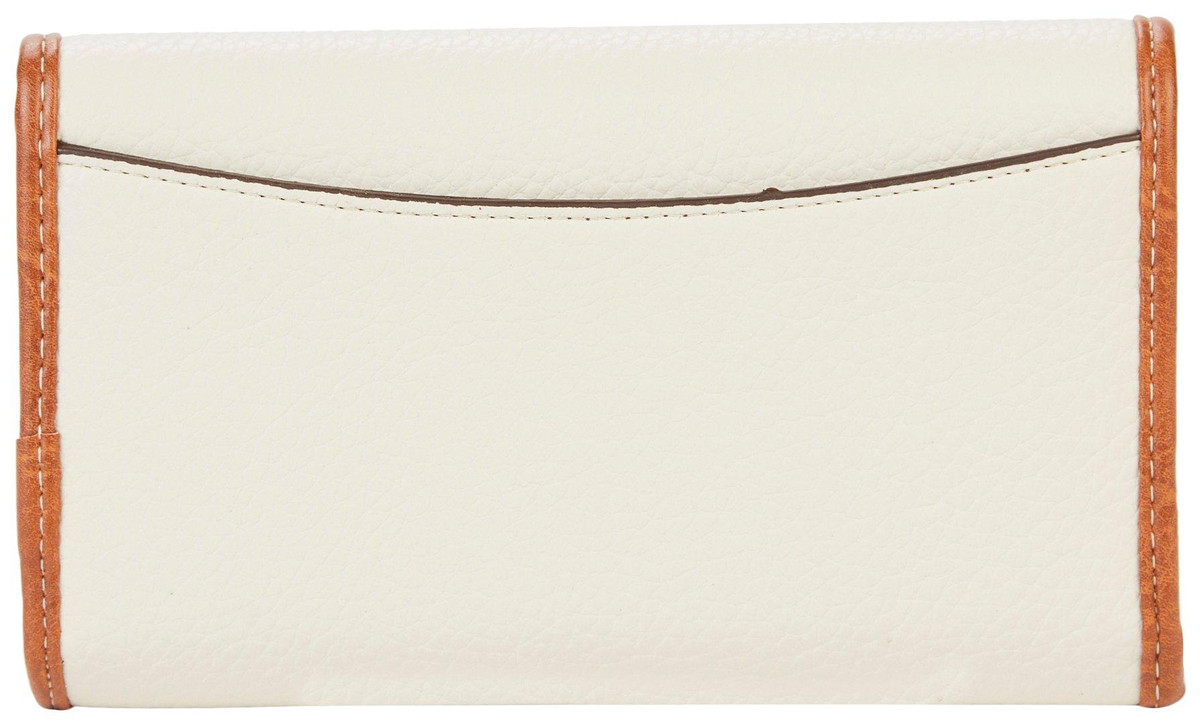 This Boc zipper wallet combines practicality with style in white pebble leather and brown trim. It includes an inner zipper pocket, multiple card holders, and an exterior pocket for quick access to essentials.