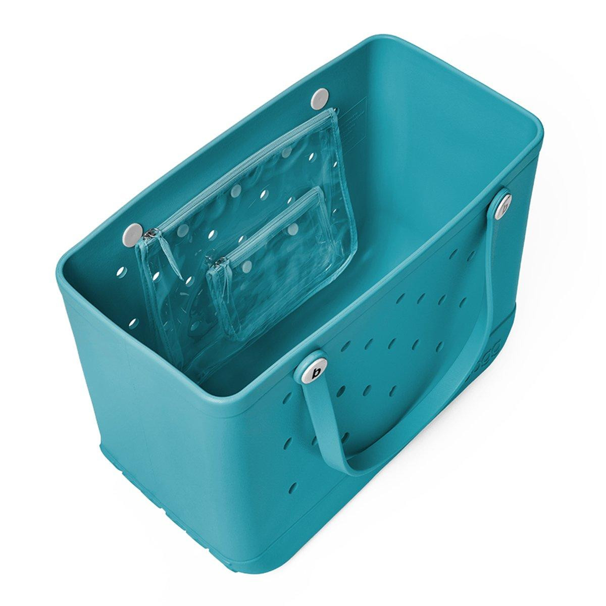This Bogg Beach Tote Bag features a solid color design on a sturdy EVA fabrication with perforated sides, a durable pebbled bottom, and dual strap handles. Bag is durable, washable, sturdy, and tip-proof. Measures approximately 19 in x 9.5 in x 15 in.