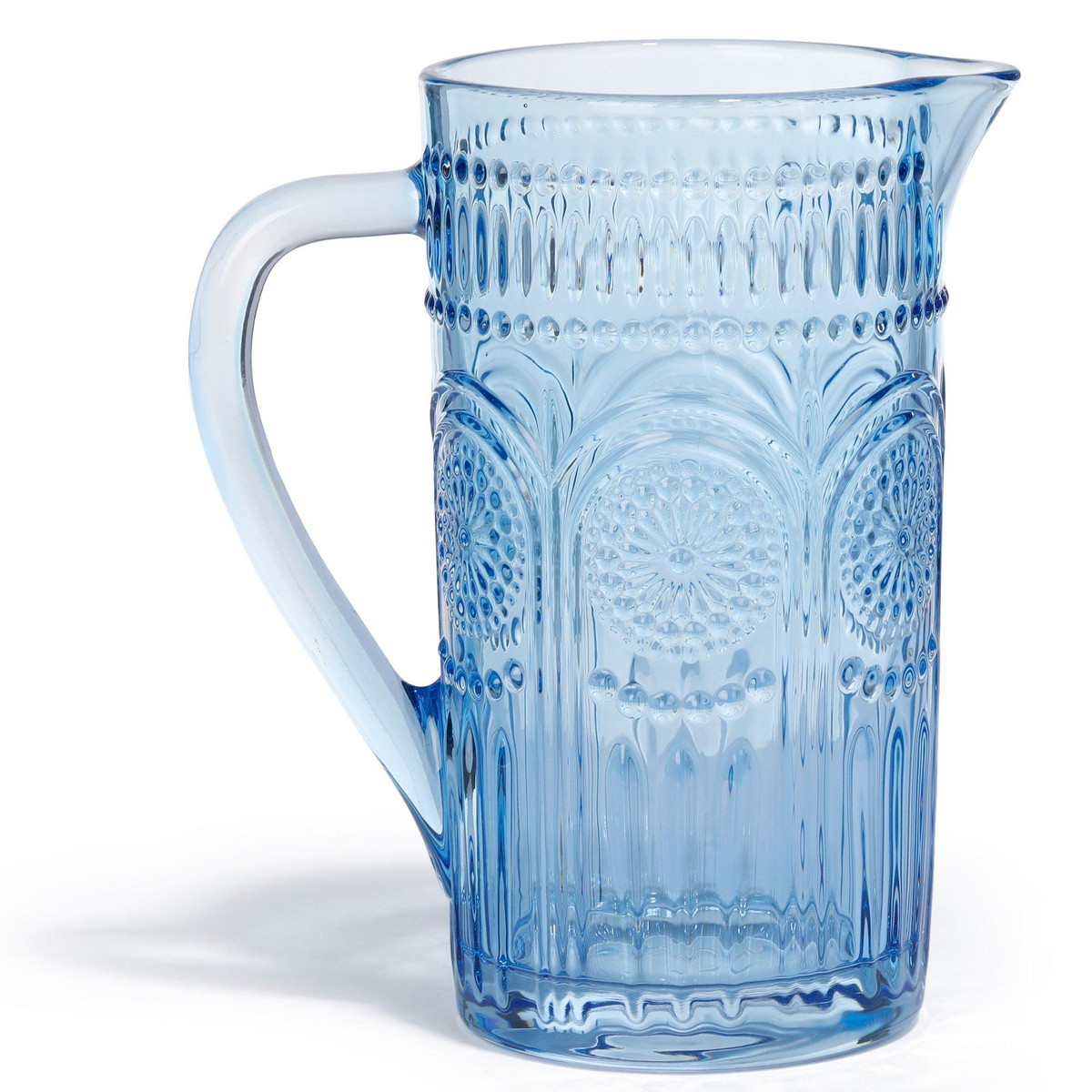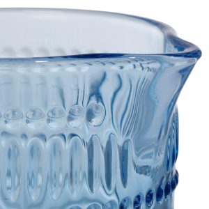 The theme of this image embodies elegance and sophistication, perfect for adding a touch of vintage charm to any table setting. The intricate patterns and vibrant sky-blue color create a beautiful and eye-catching appeal that will enhance any dining experience. – vintage charm, elegant, intricate patterns, glassware, pitcher, sophisticated, table setting, decorative, vibrant blue, eye-catching.
