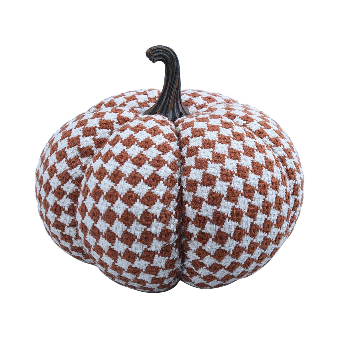 Add timeless charm to your fall décor with this 11-Inch fabric pumpkin, featuring a bold orange and white houndstooth pattern. Soft yet structured, its topped with a realistic stem and makes a cozy, stylish accent for any autumn setting. Measures: 11in. x 11in. x 10.63in.