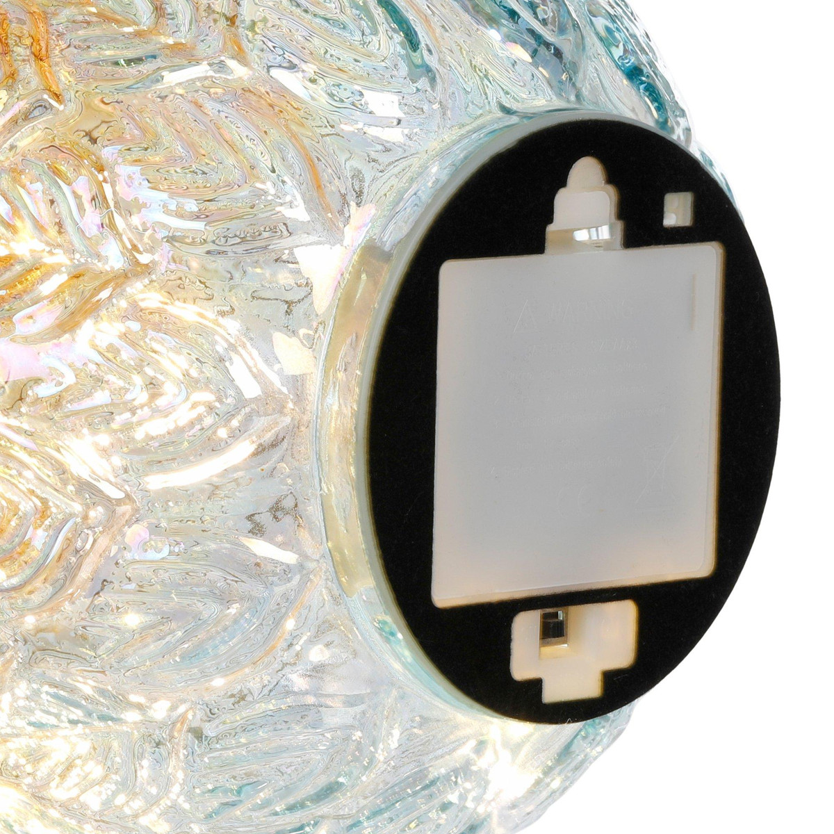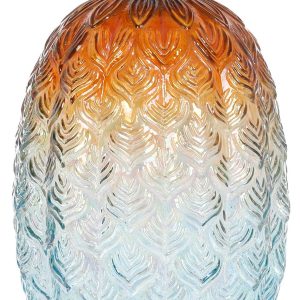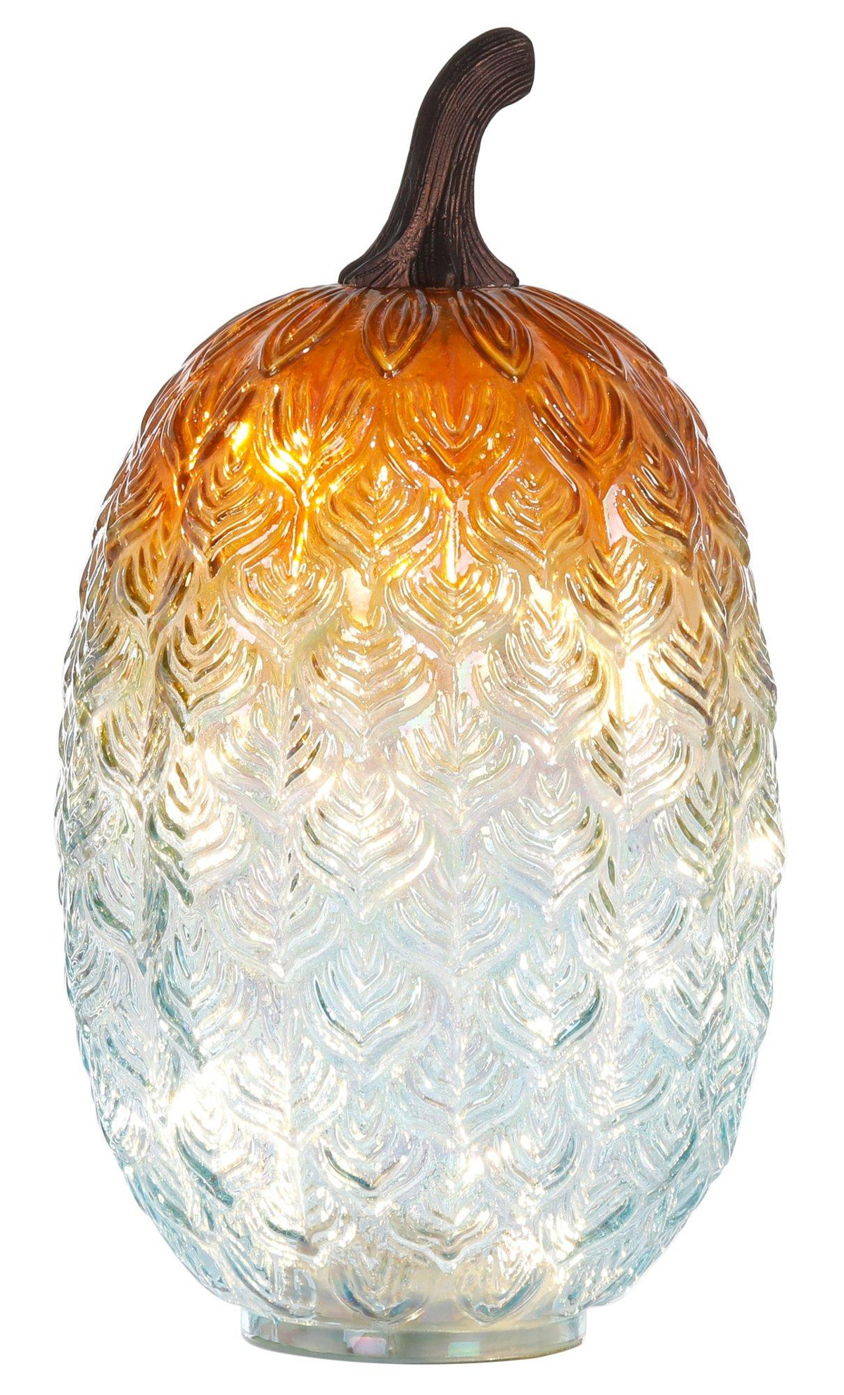 Add a warm glow to your décor with this 14 in LED Glass Pumpkin Home Accent. Featuring an embossed feather pattern, this elegant glass pumpkin is illuminated from within by LED lights for a soft, ambient effect. Ideal for autumn displays, mantel styling, or festive centerpieces. Wipe clean with a dry cloth.