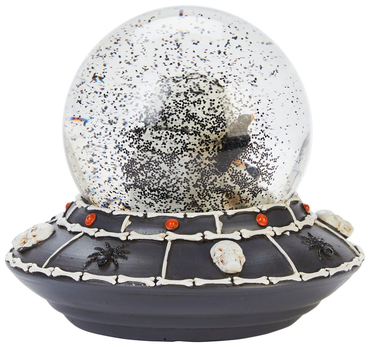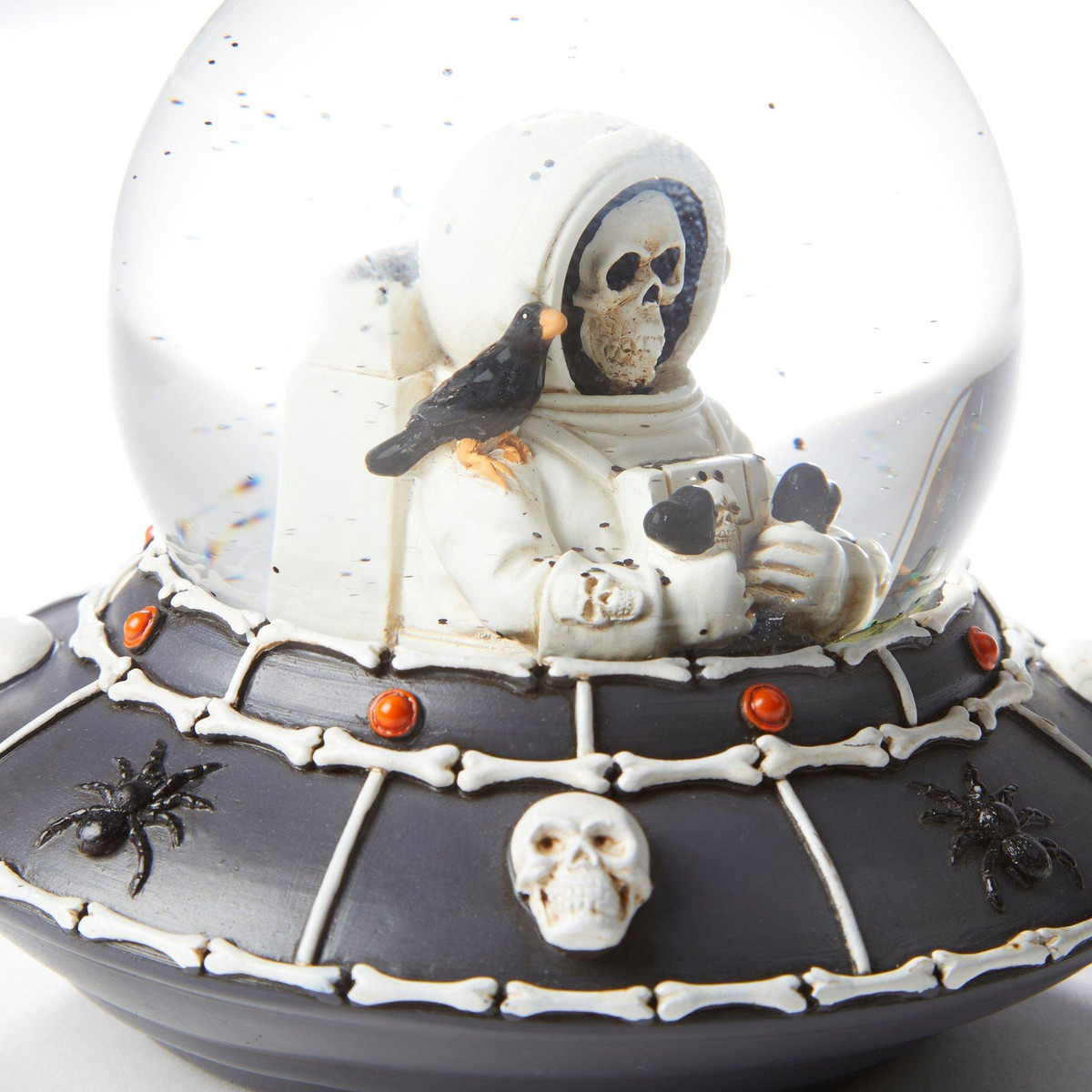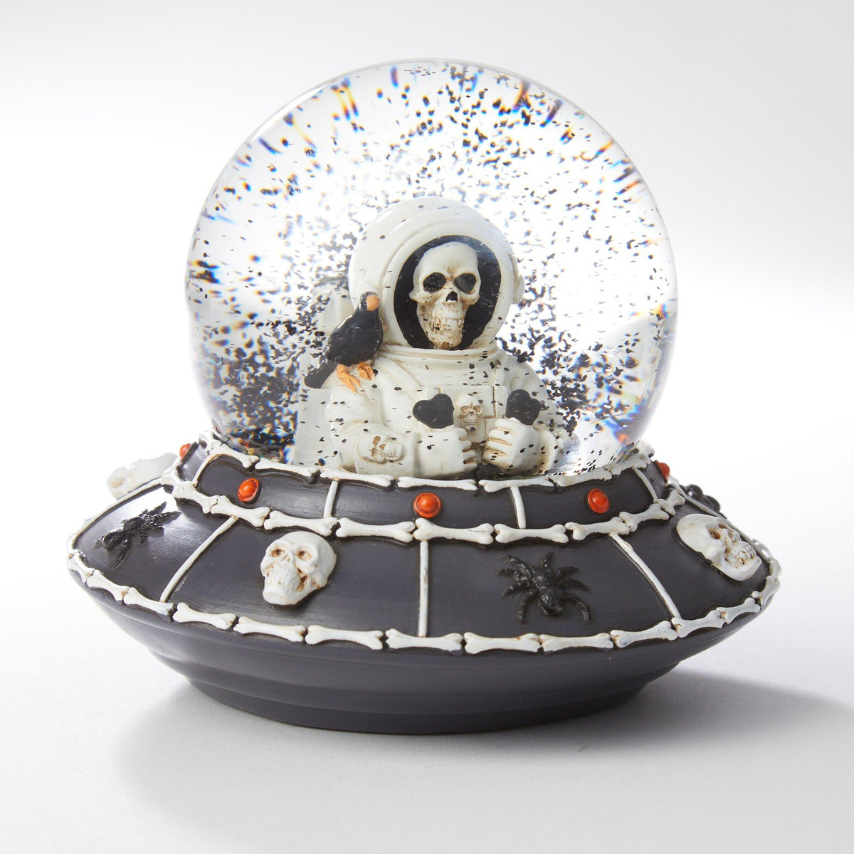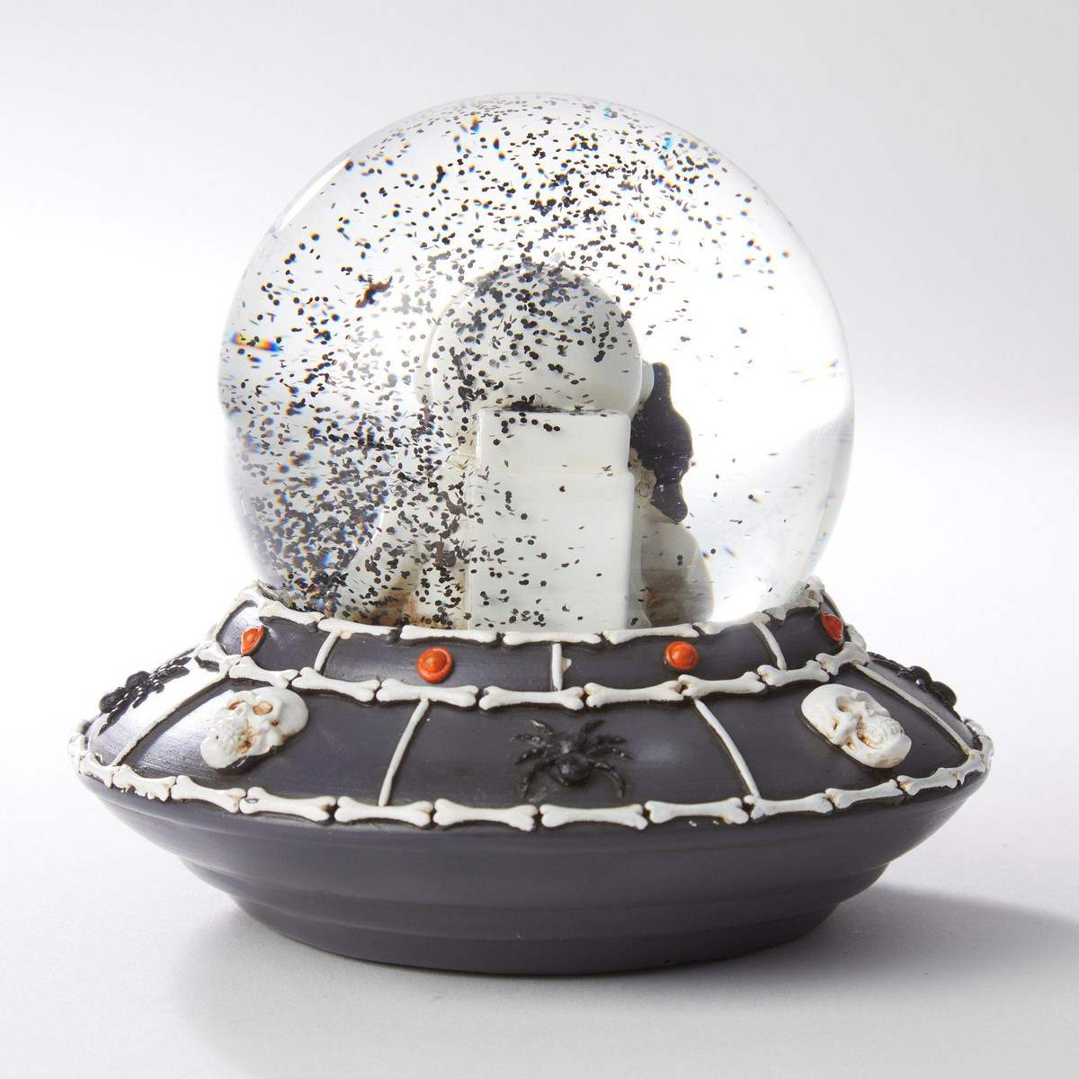Launch your Halloween décor into orbit with this eerie Skeleton Spaceship Snow Globe! Featuring a sleek black ship adorned with bone-like accents and piloted by skeletal astronauts, its the perfect blend of sci-fi and spooky. The globe captures a haunting scene thats both mysterious and otherworldly, making it a standout piece for any indoor display. Whether you’re a fan of skeletons, spaceships, or just love the strange and unusual, this snow globe is a must-have for your haunted collection.