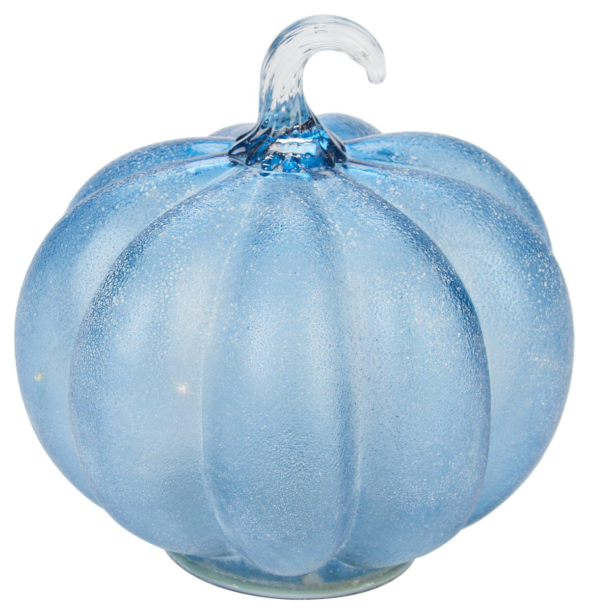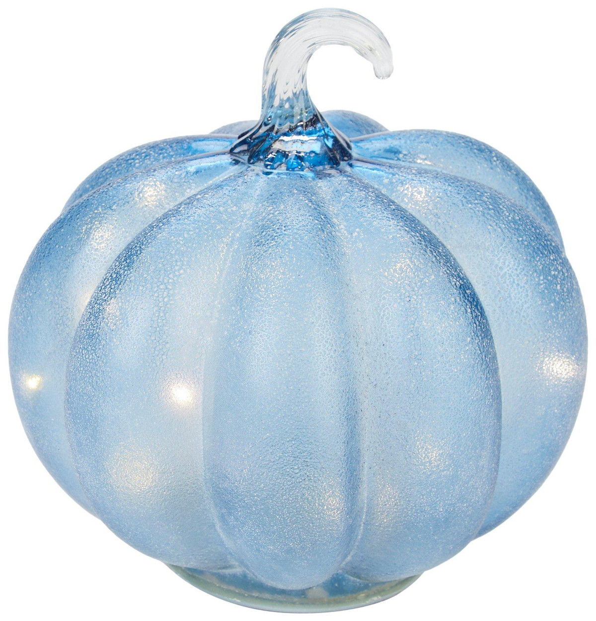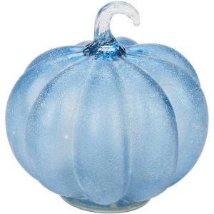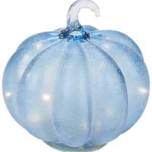 Enhance your autumn décor with this 7 in Blue Glass LED Pumpkin. Crafted from glass, painted a smokey blue, it emits a soft, ambient glow through built-in LED lighting, adding a refined touch to mantels, tables or entryways. A sculpted stem detail completes its elegant silhouette. Ideal for indoor seasonal displays. Wipe clean with a dry cloth.