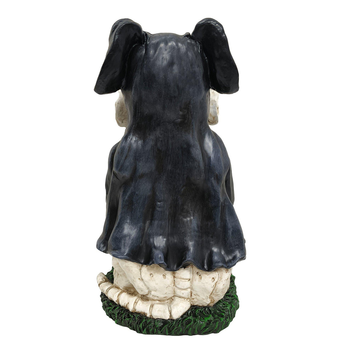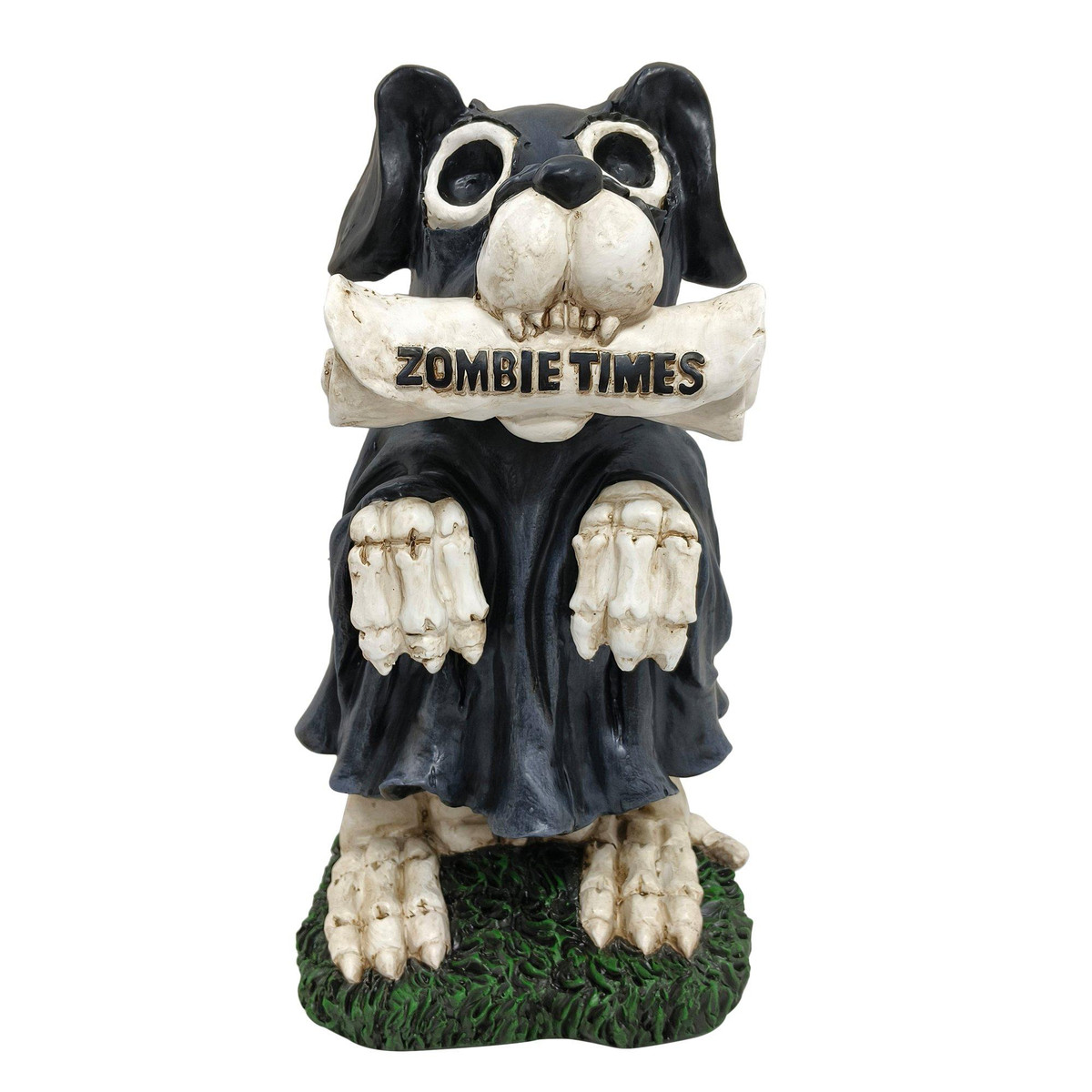 Unleash some undead charm with this 15” Halloween dog figurine! Dressed in a black robe with skeletal paws and holding a bone labeled ZOMBIE TIMES, this spooky pup stands on a grassy base for a playful pop of color. Equal parts eerie and adorable, its the perfect mix of humor and horror for your Halloween display. Measures: 8in. x 8in. x 15in.