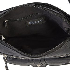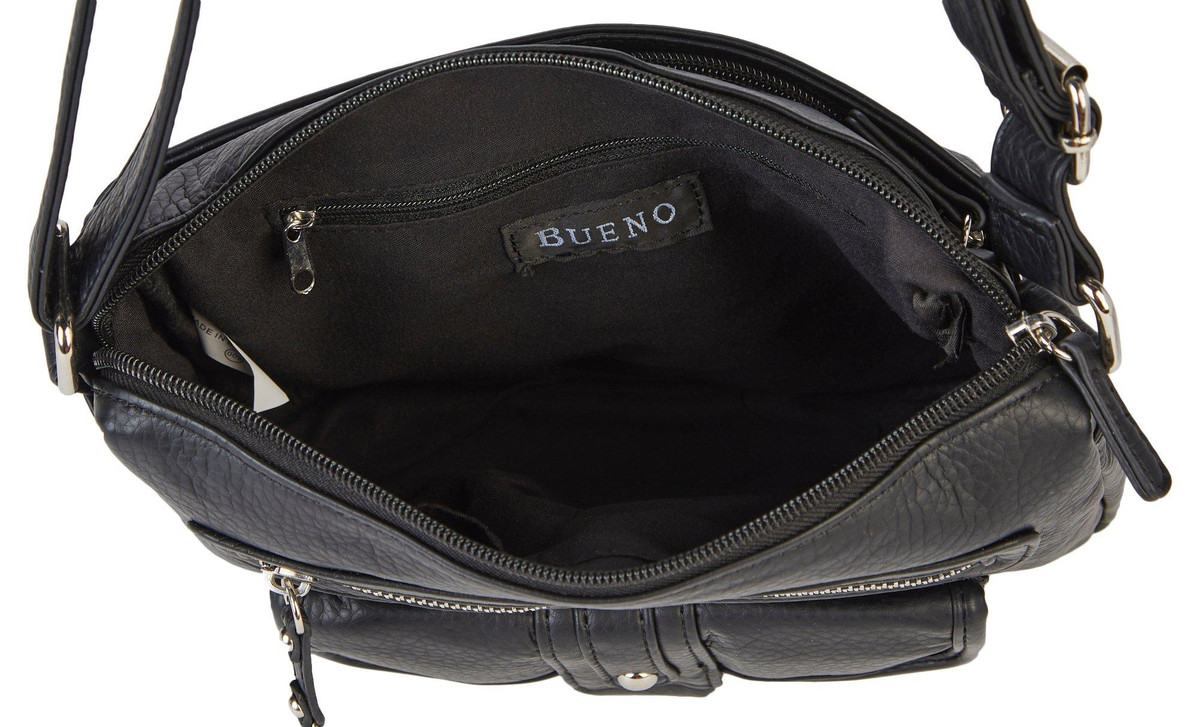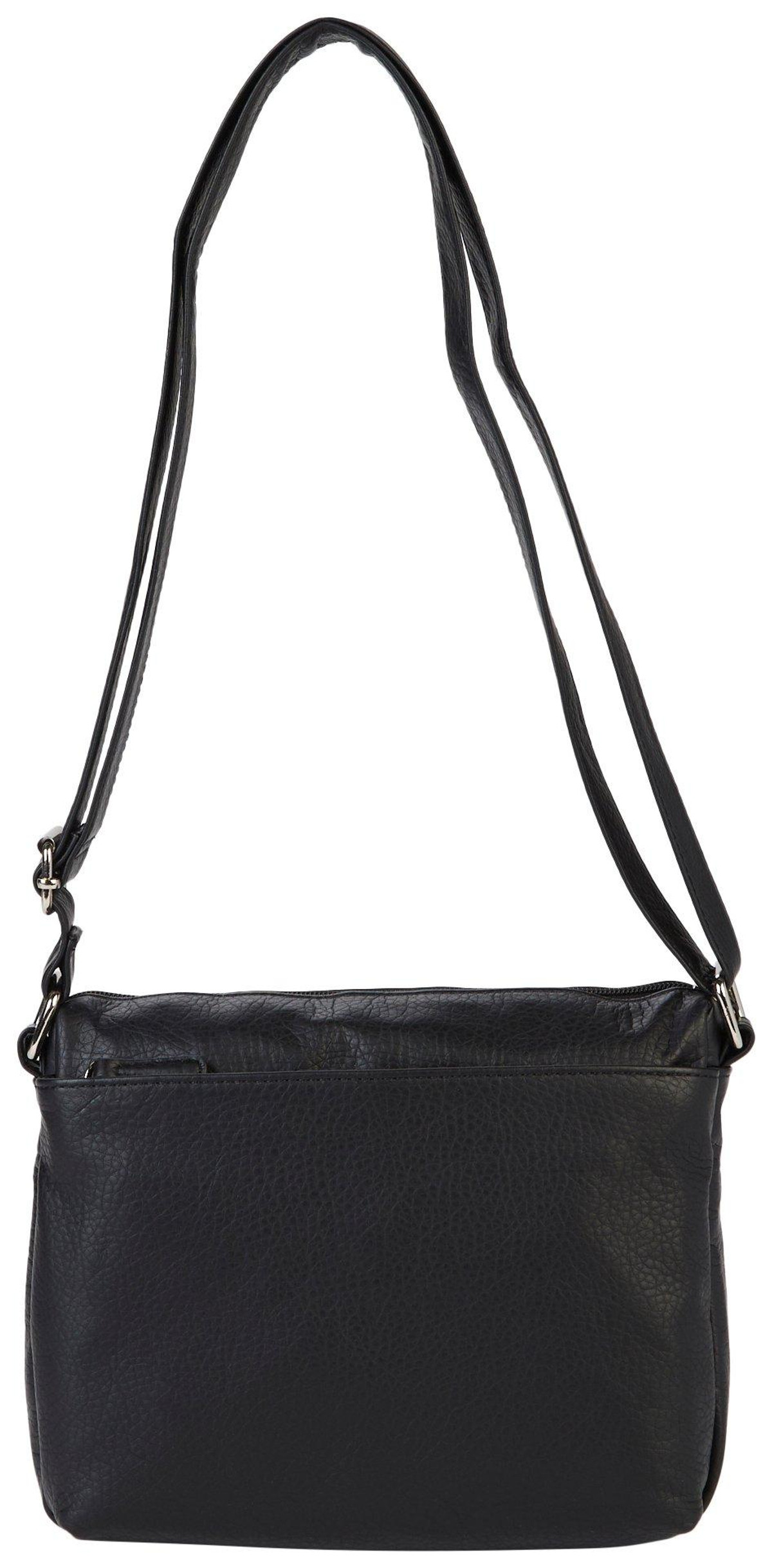 This crossbody handbag features a solid color design on soft, grainy washed, vegan leather fabrication, one front snap flap pocket with D-ring detail, one zipper pocket, one rear slip pocket, a crossbody adjustable strap, and a top zipper closure. The lined interior contains one zipper pocket and two slip pockets. Handbag measures approximately 9 in. L x 2 in. W x 7.5 in. H.