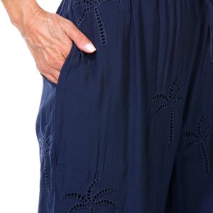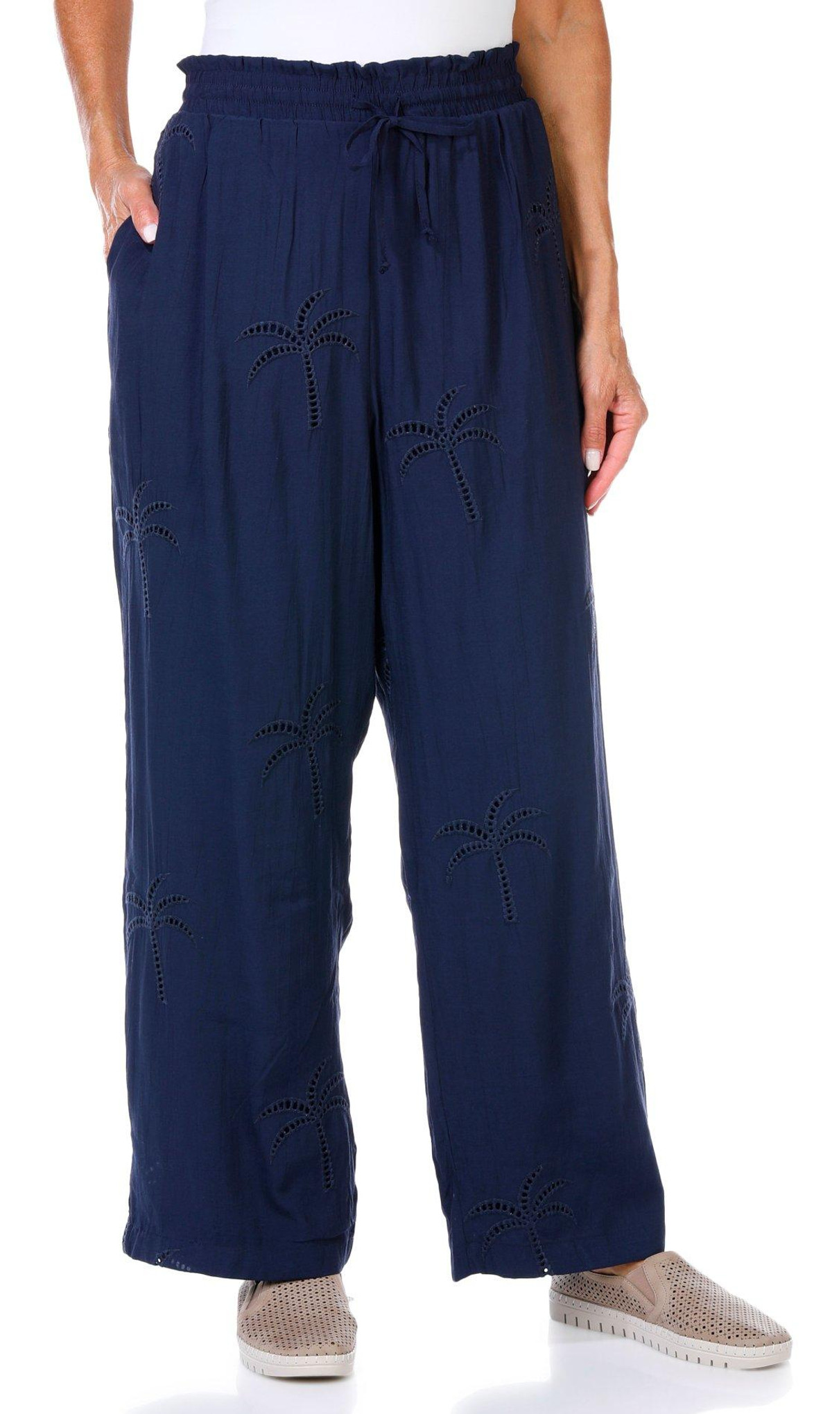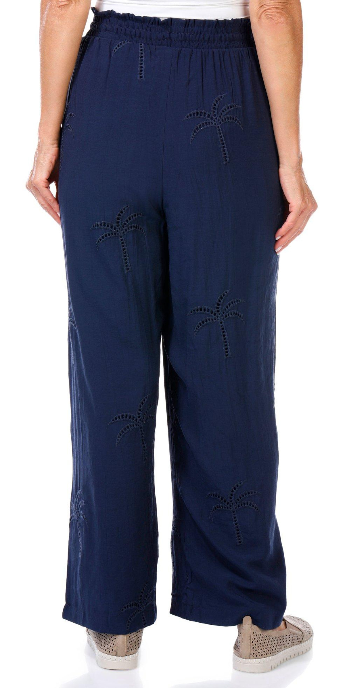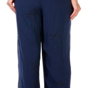 These pants feature side seam pockets and a comfortable elastic waist with drawstring for an adjustable fit. The eyelet design with palm trees adds a breezy, tropical touch, making them perfect for relaxed days with a hint of vacation style. Inseam is approximately 28 in. Fabrication is 62% rayon and 38% polyester.