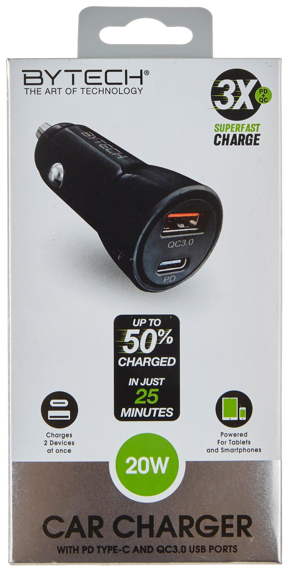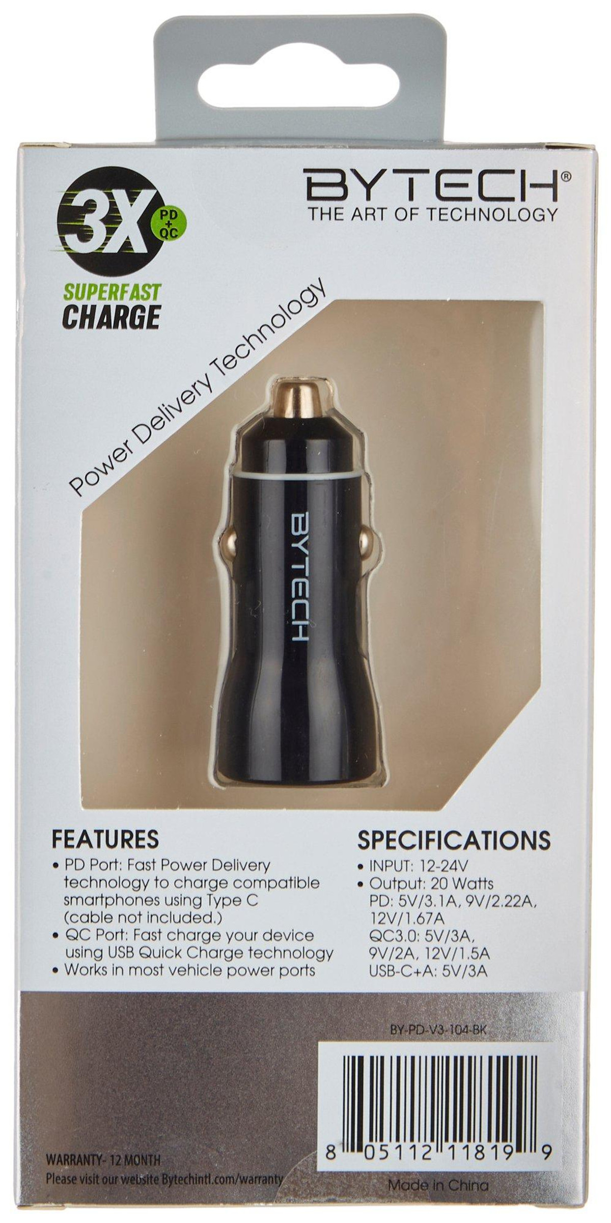 Bytech looks to seamlessly access the world of technology in a clean, lightweight and stylized way. This dual car charger features a port for Type C and USB, 3x super fast charge capability, and offers a space saving design. WARNING: CANCER AND REPRODUCTIVE HARM – WWW.P65WARNINGS.CA.GOV.