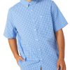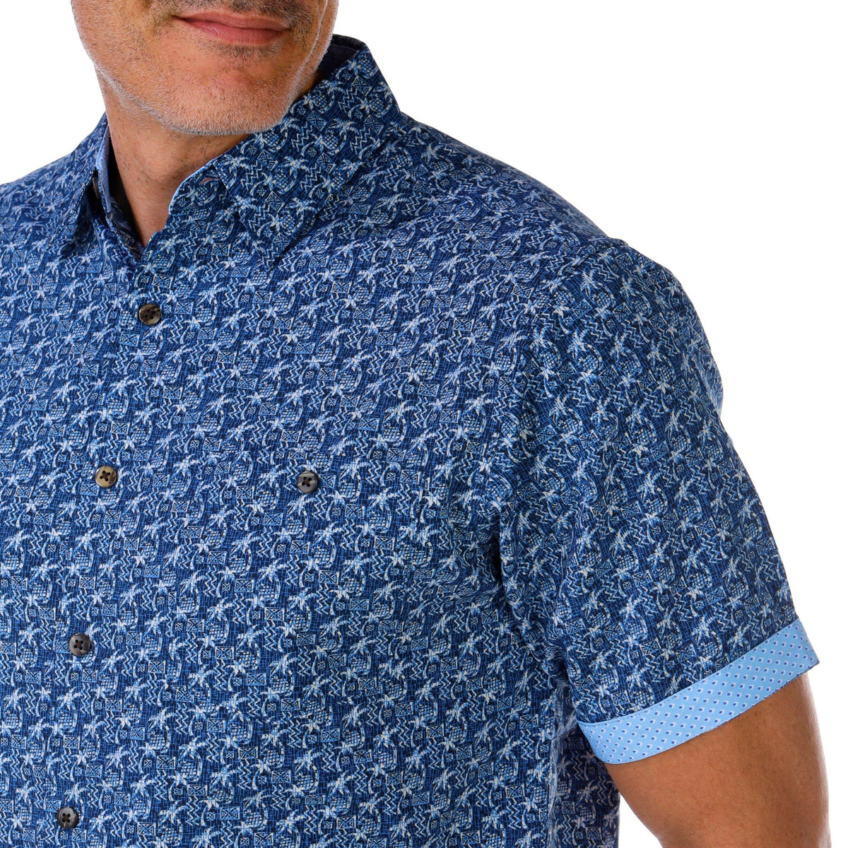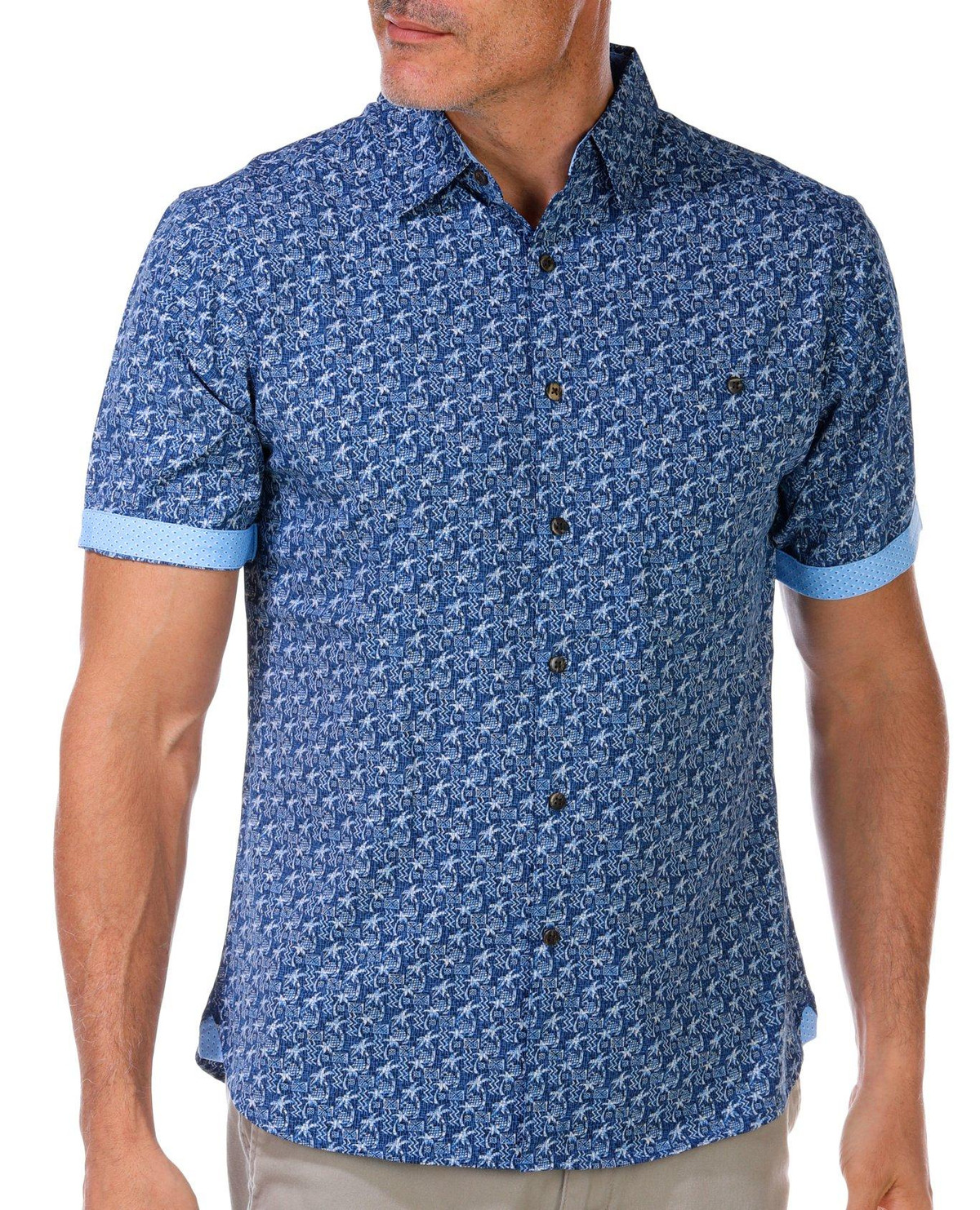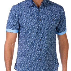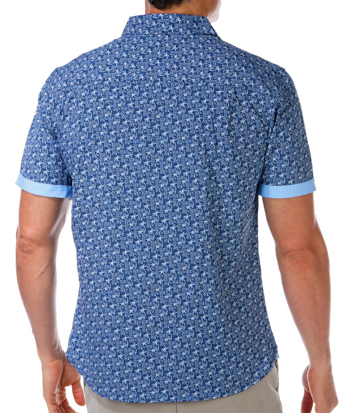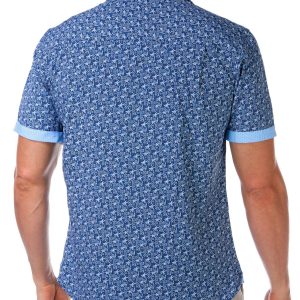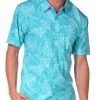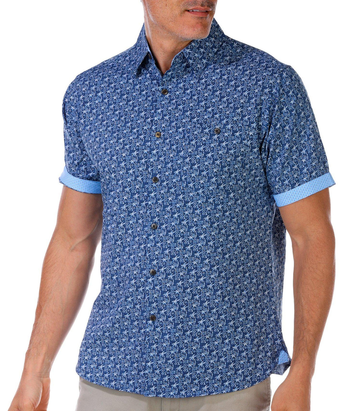 This mens tropical stretch shirt features a vibrant print with short sleeves, a collared neckline, and a button down front. Made with flexible fabric, it offers a comfortable fit and easy movement, perfect for warm weather and relaxed outings. Fabrication 92% polyester, 8% spandex.