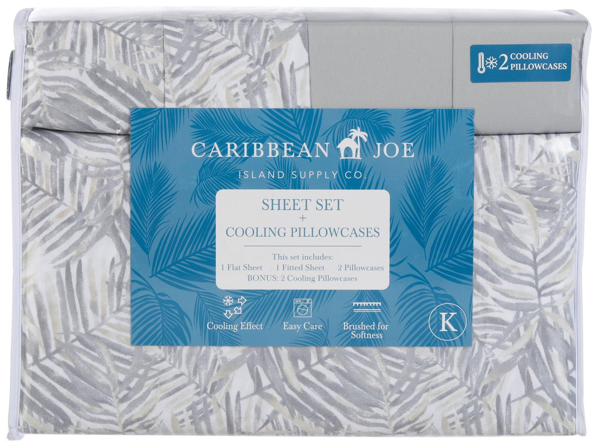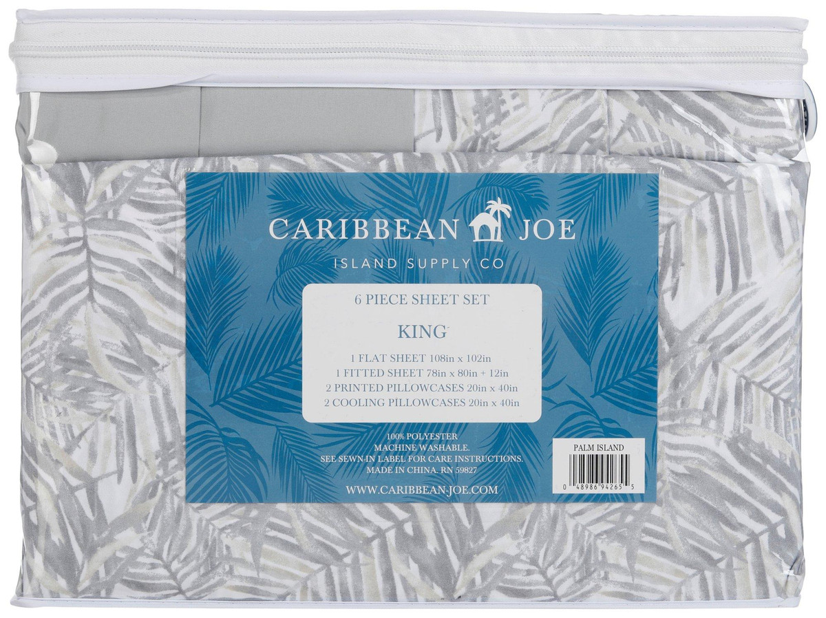 Invite calm into your space with this sheet set by Caribbean Joe called Palm Island. Featuring palm leaf prints in soft grey with delicate hints of sage, this 6-piece set includes 1 flat sheet, 1 fitted sheet, 2 printed pillow cases, and 2 cooling pillow cases. Made from 100% polyester, it brings subtle tropical flair and cozy comfort to your bedroom sanctuary.