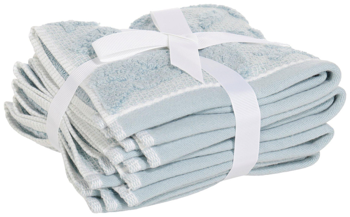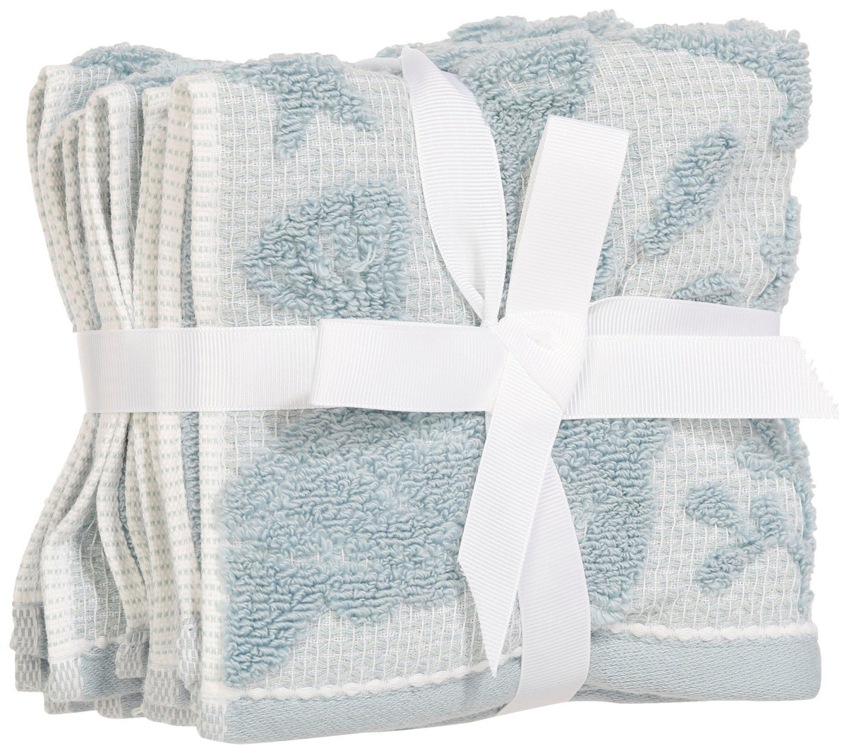 Bring a touch of coastal elegance to your home with a 4-pack of washcloths featuring an embossed pattern and matching border. Crafted from 100% premium cotton, they provide exceptional softness, absorbency, and long-lasting quality. Perfect for everyday use, they combine comfort with refined style. Fabrication is 100% cotton. Measures approximately 13 in x 13 in.