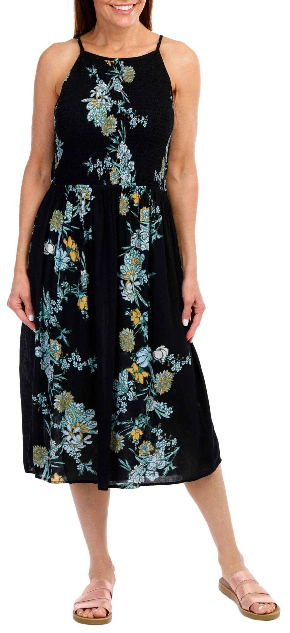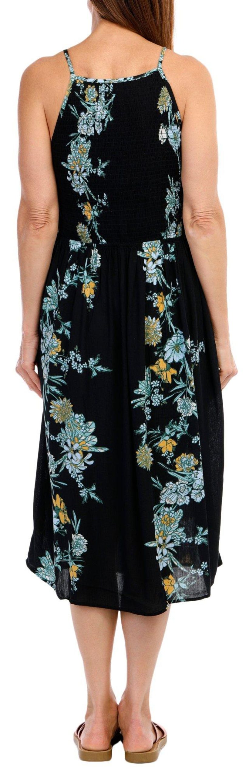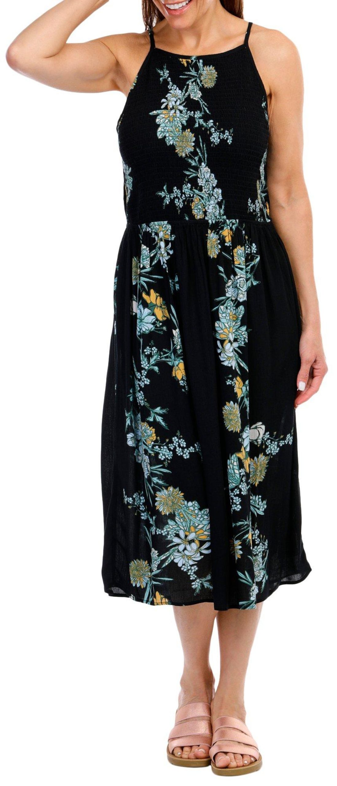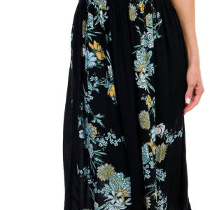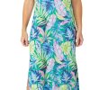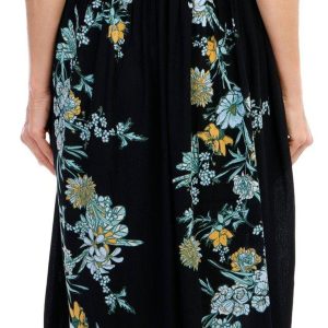 The floral Print Maxi Dress has a colorful print design, cinch detail at the neckline and side slit in the lower skirt. Length measures approximately 49 in.