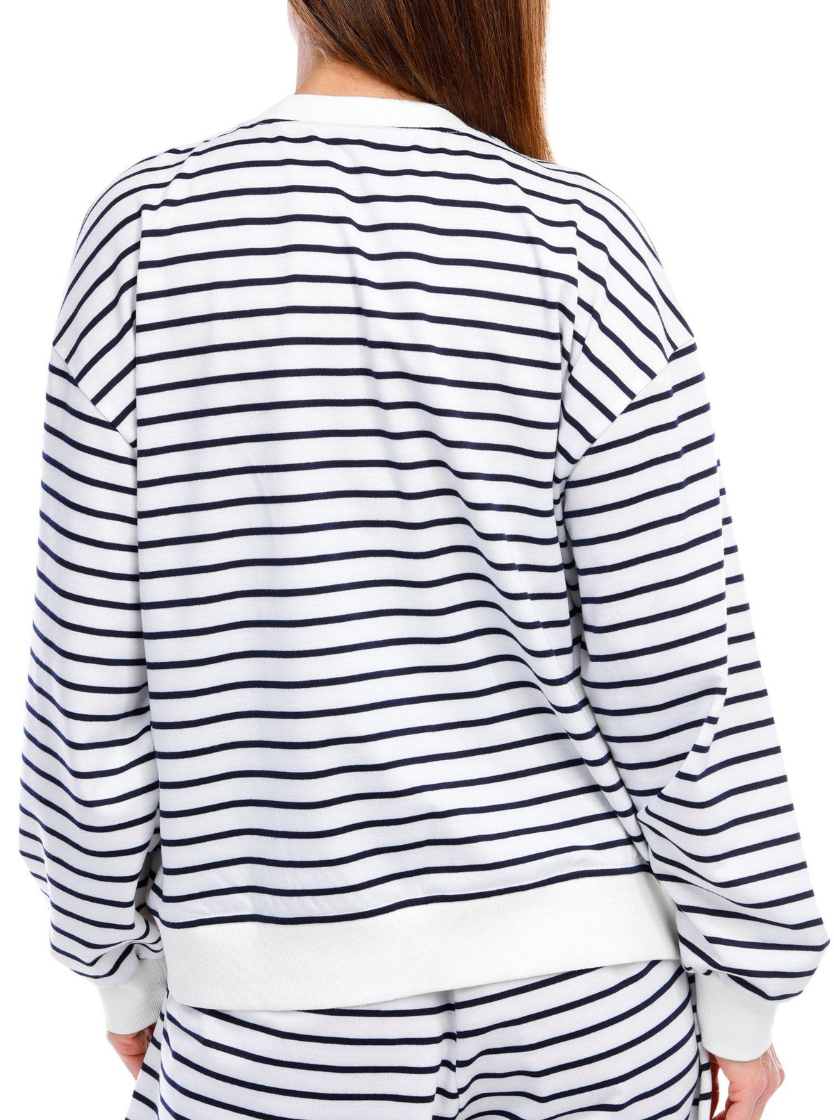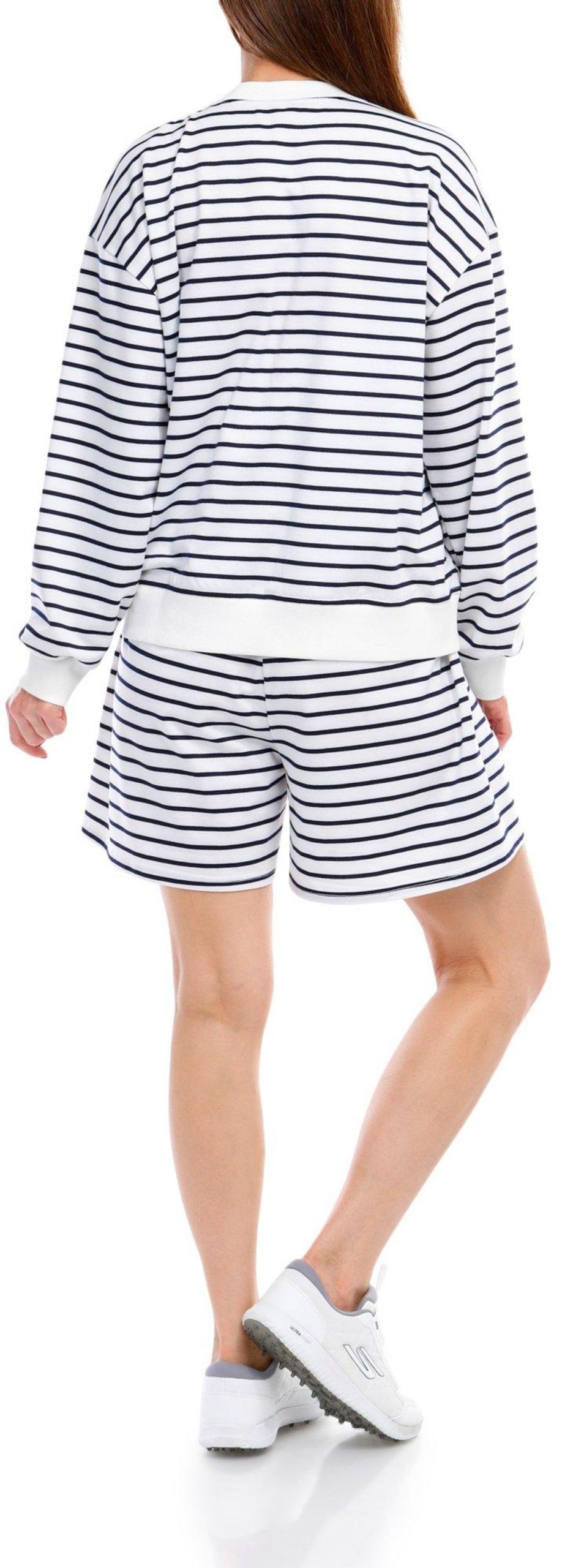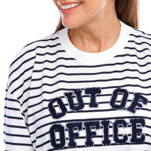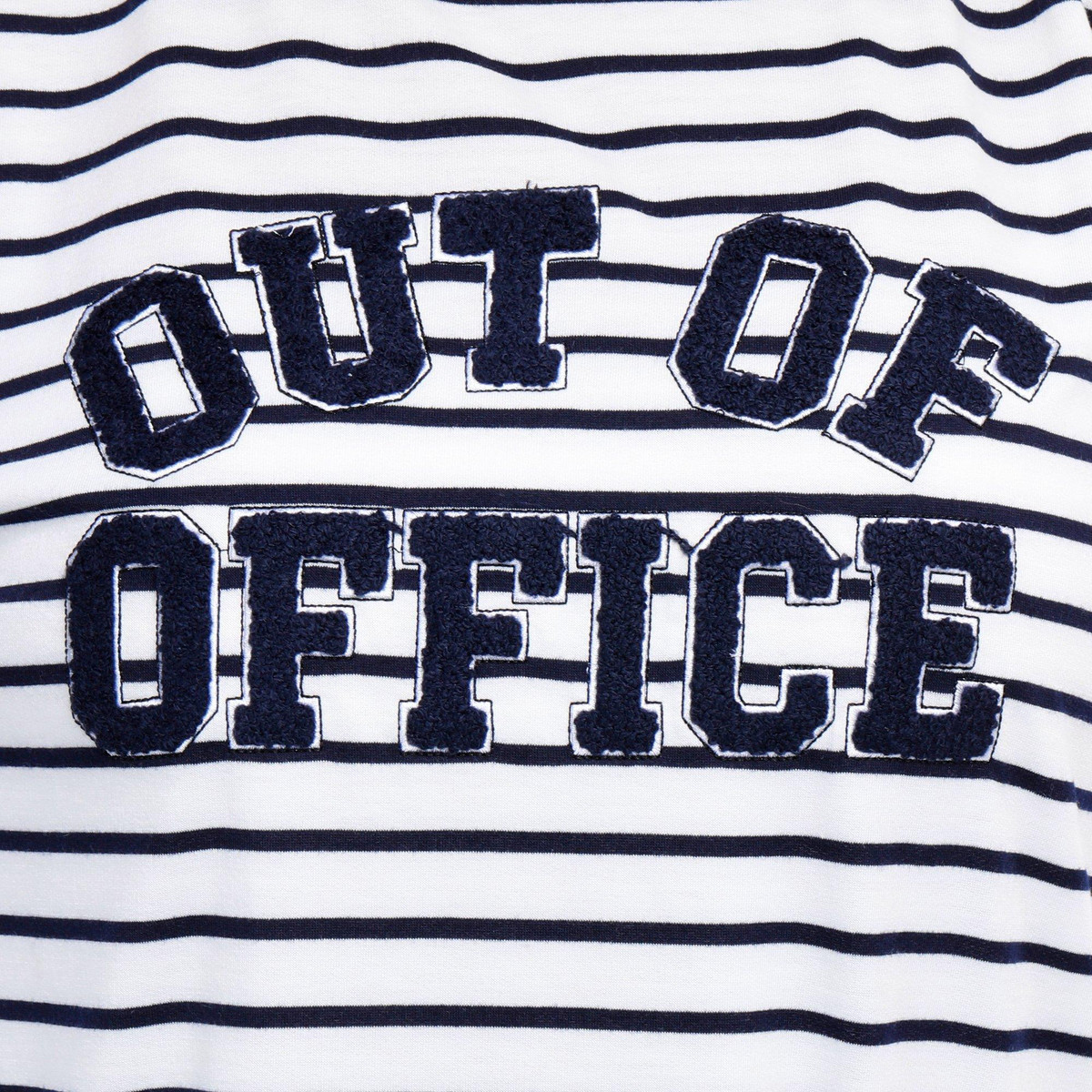 Stay cozy and stylish with this Long Sleeve Sweatshirt. Featuring a textured Out of Office motif and a chic striped print, this sweatshirt adds a playful touch to your casual wardrobe. The classic crew neck design ensures a comfortable fit, perfect for relaxed days or casual outings. Embrace the laid-back vibes and effortless style with this unique and comfortable piece. Enjoy the perfect blend of fashion and comfort with this standout sweatshirt. Fabrication is 95% polyester, 5% spandex.