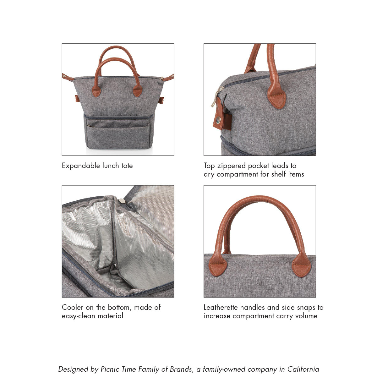 The Lunch Bag Cooler / Lunch Box is a soft cooler ideal for work, school, and small picnics. With an insulated work cooler on the bottom, a dry compartment up top and an additional front storage area to boot, theres plenty of space in this lunch tote. Two tiered lunch tote; Front flat zippered pocket leads to dry compartment for shelf items; Cooler on the bottom, made with wipeable materials; Leatherette handles and side snaps to increase compartment carry volume; 9.75” L x 5.5” W x 10.1”H